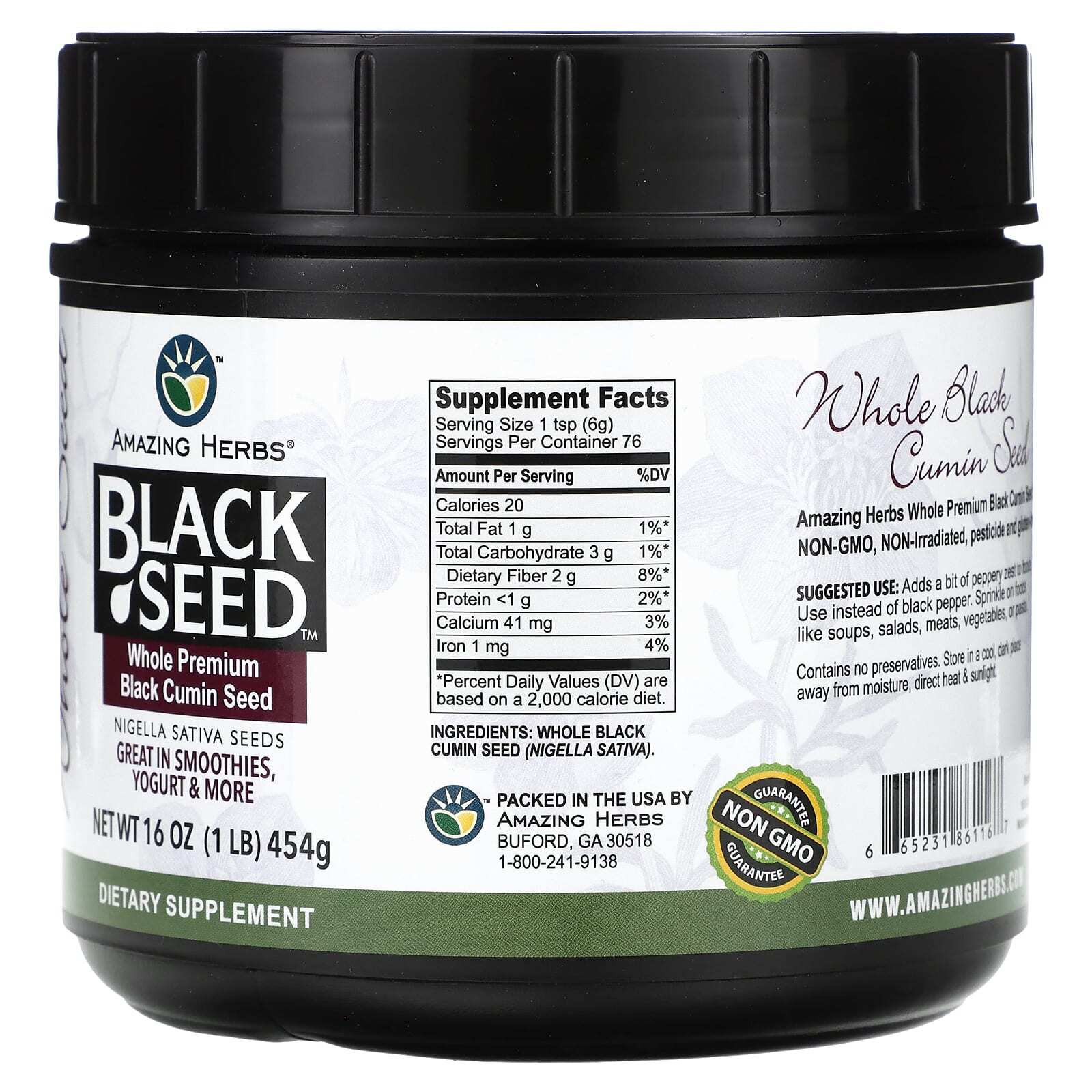 Цельные семена черного тмина премиального качества Amazing herbs не содержат ГМО, не подвергались облучению, пестицидов и глютена.
