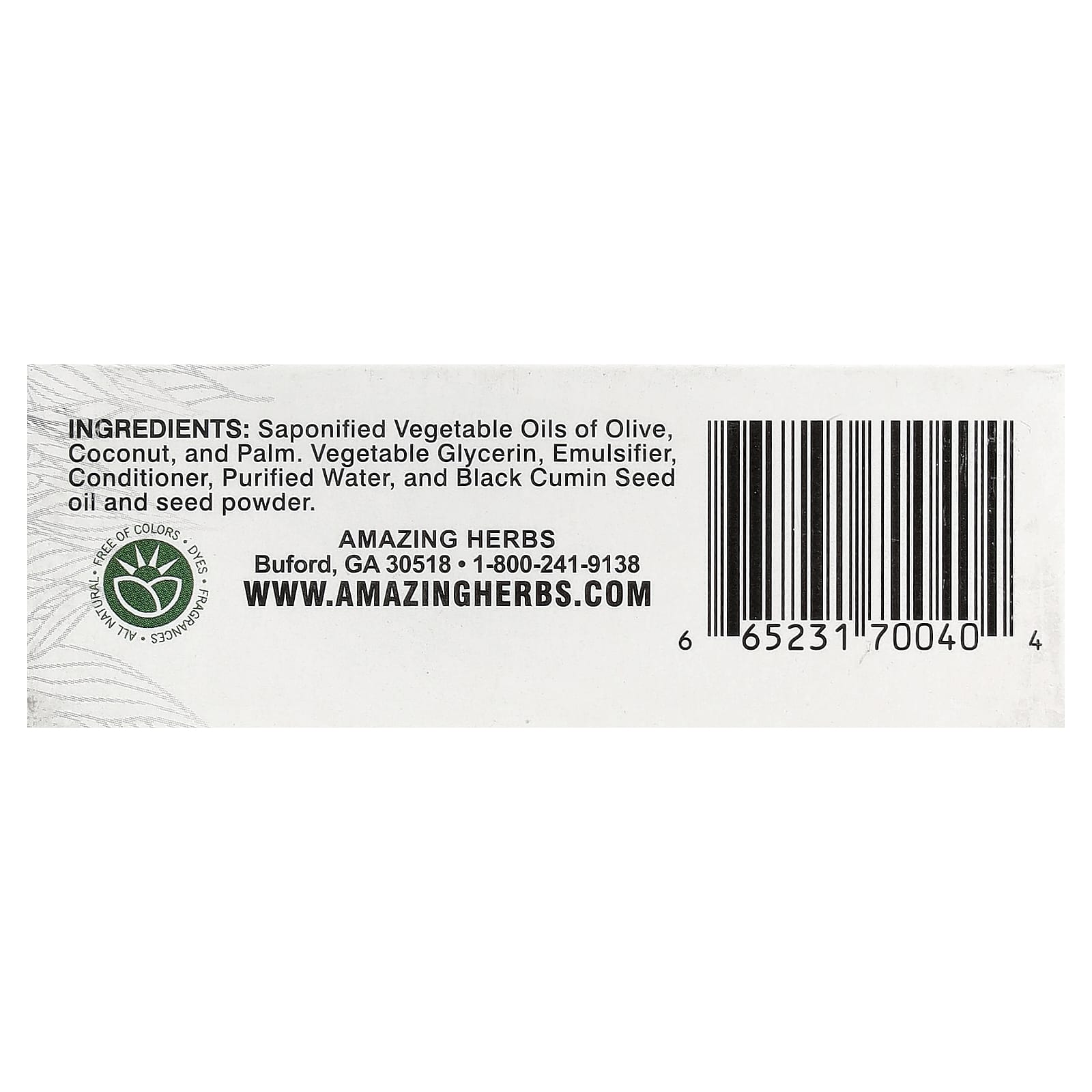 Черное растительное и глицериновое мыло Amazing Herbs увлажняет и притягивает влагу к коже. Отлично подходит для чувствительной кожи, он содержит 100% чистое масло семян черного тмина холодного отжима и содержит питательные незаменимые жирные кислоты (незаменимые жирные кислоты) и антиоксиданты, а также молотый черный тмин, растительный глицерин, оливковое и кокосовое масла. помогает смягчить кожу и восстановить ее естественный баланс.