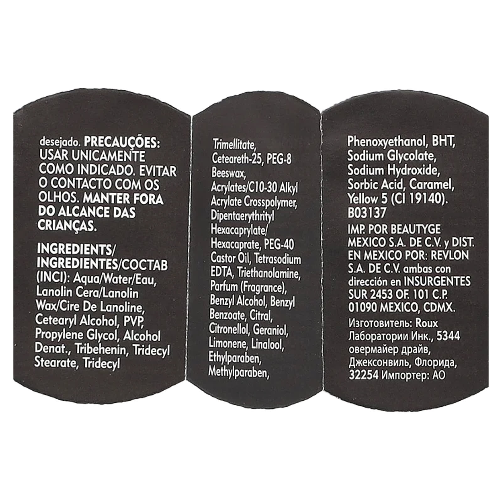 Вода (Aqua/eau), ланолин цера / ланолиновый воск / цире де ланолин, цетеариловый спирт, ПВП, пропиленгликоль, денатурированный спирт, трибехенин, тридецил стеарат, тридецил тримеллитат, цетеарет-25, ПЭГ-8 пчелиный воск, акрилат/c10-30 алкил акрилат кроссполимер, дипентаэритритил гексакаприлат / гексакапрат, ПЭГ-40 касторовое масло, тетранатрия ЭДТК, триэтаноламин, парфюмерная композиция (отдушка), бензиловый спирт, бензилбензоат, цитраль, цитронеллол, гераниола, лимонена, линалоол, этилпарабена, метилпарабен, феноксиэтанол, бутилгидрокситолуол, гликолят натрия, гидроксид натрия, сорбиновая кислота, карамель, желтый 5 (CI 19140).
