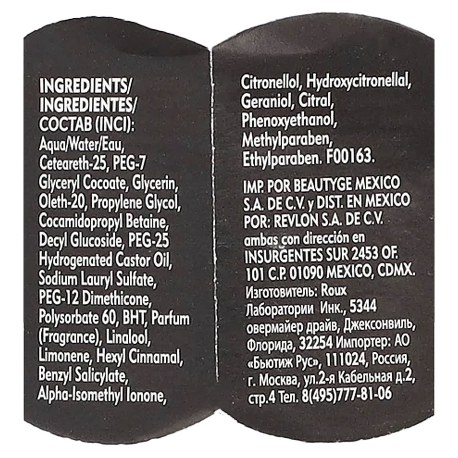 Вода (Aqua/eau), цетеарет-25, ПЭГ-7 глицерил кокоат, глицерин, олет-20, пропиленгликоль, кокамидопропилбетаин, децил глюкозид, ПЭГ-25 гидрогенизированное касторовое масло, лаурилсульфата натрия, ПЭГ-12 диметикон, полисорбат 60, бутилгидрокситолуол, парфюмерная композиция (отдушка), линалоол, лимонена, гексил циннамал, бензилсалицилат, альфа-изометилионон, цитронеллола, гидроксицитронеллаль, гераниола, цитраль, феноксиэтанол, метилпарабен, этилпарабен.