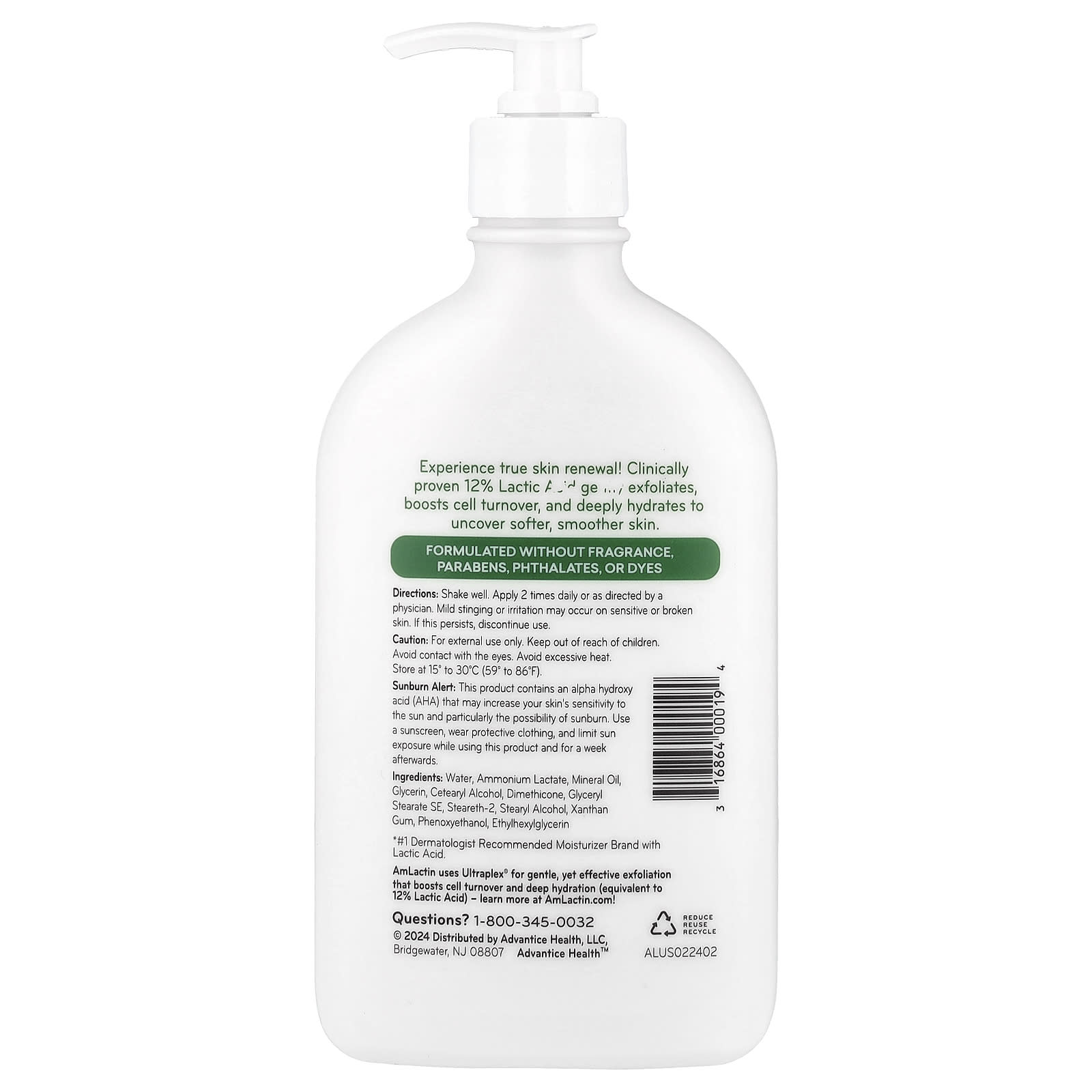 В AmLactin используется ингредиент Ultraplex® для нежного, но эффективного отшелушивания, который ускоряет обновление клеток и обеспечивает глубокое увлажнение (эквивалент 12% молочной кислоты).