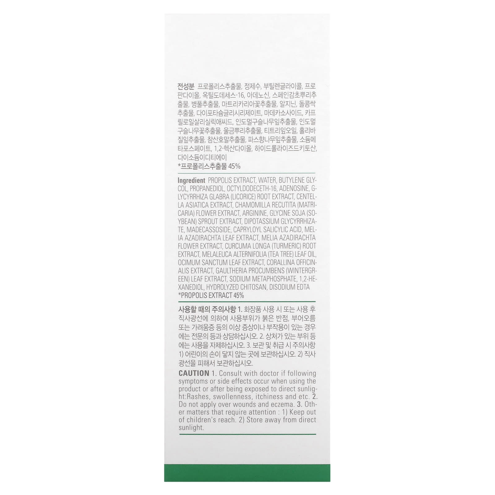 Экстракт прополиса, вода, бутиленгликоль, пропандиол, октилдодецет-16, аденозин, экстракт корня солодки (Glycyrrhiza glabra), экстракт готу колы (Centella asiatica), экстракт цветков ромашки лекарственной (Chamomilla recutita), аргинин, экстракт ростков сои (Glycine soja), дикалия глицирризат, мадекассосид, каприлоил салициловой кислоты, экстракт листьев дерева ним (Melia azadirachta), экстракт цветков дерева ним (Melia azadirachta), экстракт корня куркумы (Curcuma longa), масло из листьев чайного дерева (Melaleuca alternifolia), экстракт листьев туласи (Ocimum sanctum), экстракт кораллины целебной (Corallina officinalis), экстракт листьев грушанки (Gaultheria procumbens), метафосфат натрия, 1,2-гександиол, гидролизованный хитозан, двунатриевая ЭДТК.