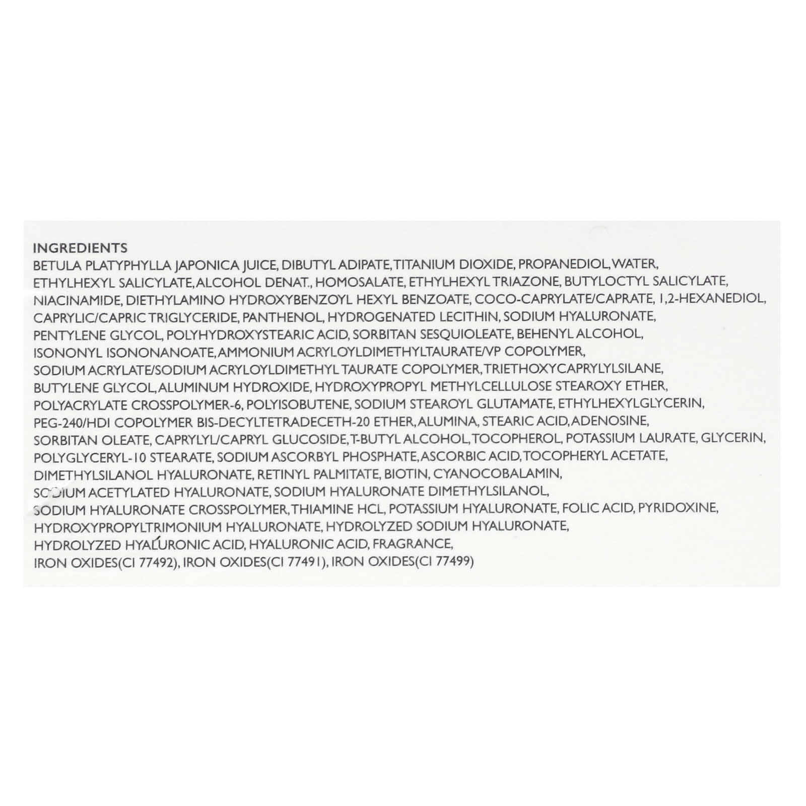Сок японской белой березы (Betula platyphylla japonica), дибутиладипат, диоксид титана, пропандиол, вода, этилгексил салицилат, денатурированный спирт, гомосалат, этилгексил триазон, бутилоктилсалицилат, никотинамид, диэтиламиногидроксибензоил гексил бензоат, коко-каприлат/капрат, 1,2-гександиол, каприловый/каприновый триглицерид, пантенол, гидрогенизированный лецитин, гиалуронат натрия, пентилен гликоль, полигидроксистеариновая кислота, сорбитана сесквиолеат, бегениловый спирт, изононил изононаноат, аммоний акрилоилдиметилтаурат/ВП сополимер, натрий акрилат/натрий акрилоилдиметилтаурат сополимер, триэтоксикаприлилсилан, бутиленгликоль, гидроксид алюминия, стеароксиэфир гидроксипропилметилцеллюлозы, полиакрилата кроссполимер-6, полиизобутен, натрия стеароил глутамат, этилгексилглицерин, ПЭГ-240 / HDI сополимер бис-децилтетрадецет-20 эфир, оксид алюминия, стеариновая кислота, аденозин, сорбитанолеат, каприлил/каприл глюкозид, Т-бутиловый спирт, токоферол, лаурат калия, глицерин, полиглицерил-10 стеарат, аскорбил фосфат натрия, аскорбиновая кислота, токоферилацетат, диметилсиланола гиалуронат, ретинилпальмитат, биотин, цианокобаламин, ацетилированный гиалуронат натрия, гиалуронат натрия диметилсиланол, кроссполимер гиалуроната натрия, тиамина гидрохлорид, гиалуронат калия, фолиевая кислота, пиридоксин, гиалуронат гидроксипропилтримония, гидролизованный гиалуронат натрия, гидролизованная гиалуроновая кислота, гиалуроновая кислота, отдушка, оксиды железа (CI 77492), оксиды железа (CI 77491), оксиды железа (CI 77499)