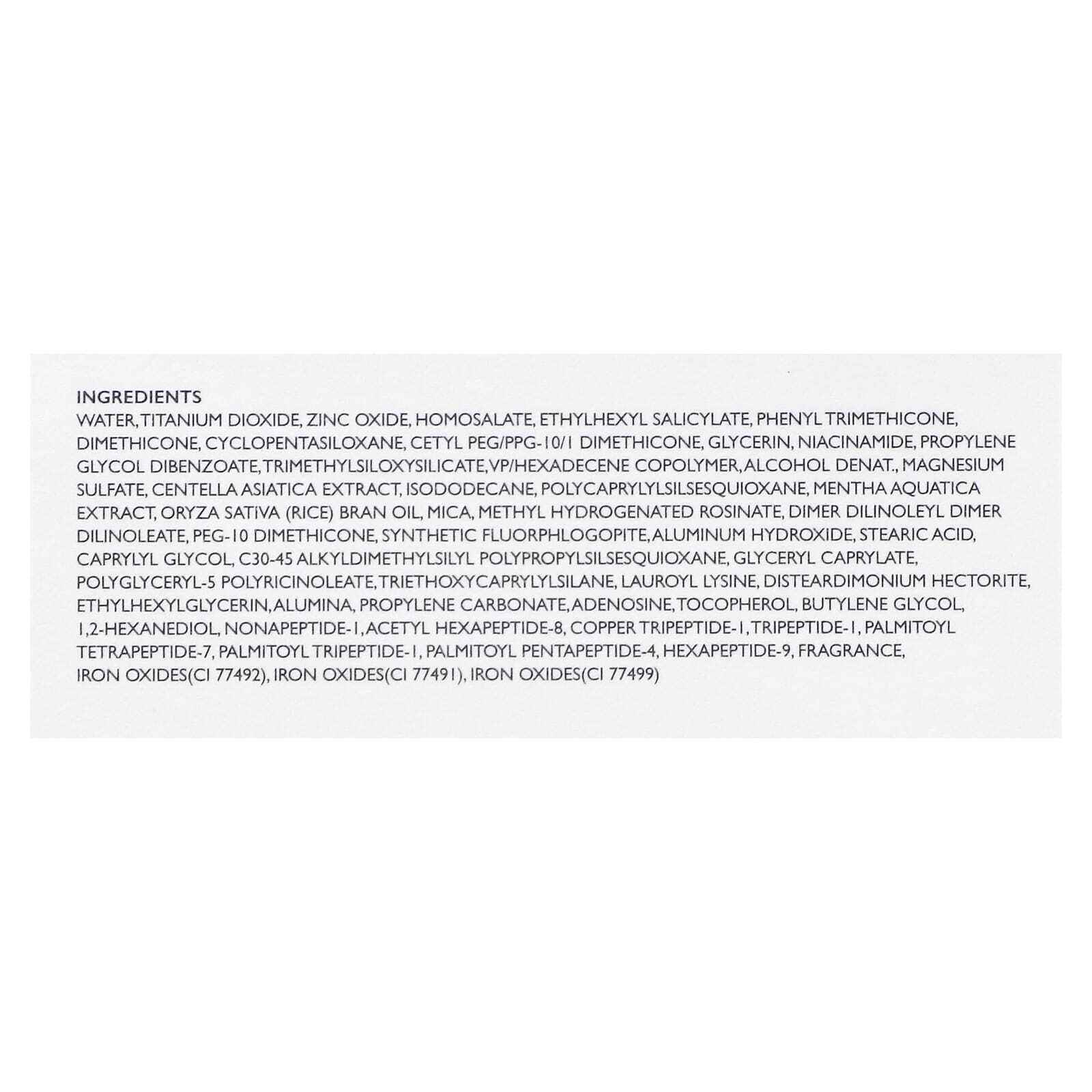 Вода, диоксид титана, оксид цинка, гомосалат, этилгексил салицилат, фенилтриметикон, диметикон, циклопентасилоксан, цетил ПЭГ/ППГ-10/1 диметикон, глицерин, никотинамид, пропиленгликоль дибензоат, триметилсилоксисиликат, сополимер ВП / гексадецена, денатный спирт., сульфат магния, экстракт готу колы (Centella asiatica), изододекан, поликаприлилсилсесквиоксан, экстракт мяты водной, масло из рисовых отрубей (Oryza sativa), слюда, метил-гидрогенизированный розинат, димер дилинолеил димер дилинолеат, ПЭГ-10 диметикон, синтетический фторфлогопит, гидроксид алюминия, стеариновая кислота, каприлилгликоль, c30-45 алкилдиметилсилил полипропилсилcесквиоксан, глицерил каприлат, полиглицерил-5 полирицинолеат, триэтоксикаприлилсилан, лаурил лизин, дистеардимониум гекторит, этилгексилглицерин, оксид алюминия, пропиленкарбонат, аденозин, токоферол, бутиленгликоль, 1,2-гександиол, нонапептид-i, ацетил гексапептид-8, трипептид меди-1, трипептид-1, пальмитоил тетрапептид-7, пальмитоил трипептид-1, пальмитоил пентапептид-4, гексапептид-9, отдушка, оксиды железа (CI 77492), оксиды железа (CI 77491), оксиды железа (CI 77499).