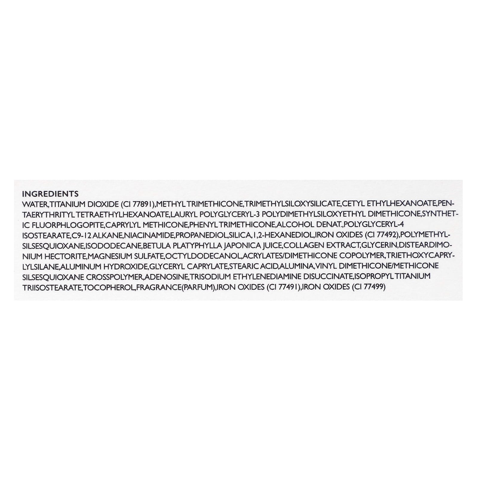 Вода, диоксид титана (CI 77891), метилтриметикон, триметилсилоксисиликат, цетилэтилгексаноат, пентаэритритил тетраэтилгексаноат, лаурилполиглицерил-3-полидиметилсилоксиэтилдиметикон, синтетический фторфлогопит, каприлил метикон, фенилтриметикон, денатурированный спирт, полиглицерил-4 изостеарат, алкан c9-12, никотинамид, пропандиол, диоксид кремния, 1,2-гександиол, оксиды железа (CI 77492), полиметилсилсесквиоксан, изододекан, сок Betula platyphylla japonica, экстракт коллагена, глицерин, дистеардимония гекторит, сульфат магния, октилдодеканол, сополимер акрилатов / диметикона, триэтоксикаприлилсилан, гидроксид алюминия, глицерил каприлат, стеариновая кислота, оксид алюминия, винил диметикон/метикон силсесквиоксан кроссполимер, аденозин, изопропиловый триизостеарат титана, тринатрия этилендиамин дисукцинат, токоферол, отдушка (парфюмерная композиция), оксиды железа (CI 77491), оксиды железа (CI 77499)