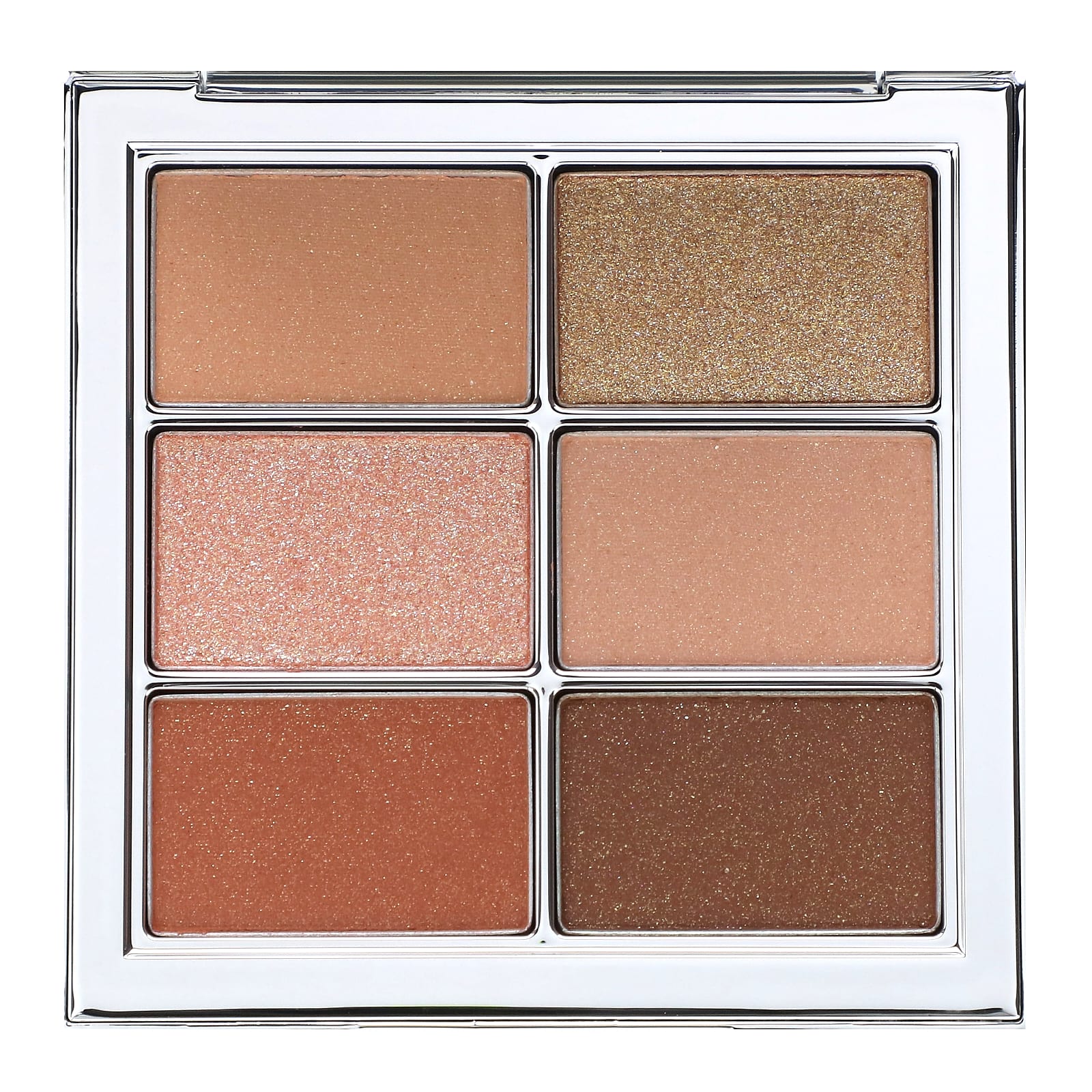 Веганская палитра теней с полупрозрачным глиттером. Она включает 6 светлых оттенков, которые можно смешивать с 3 текстурами — матовой, сатиновой и блестящей.