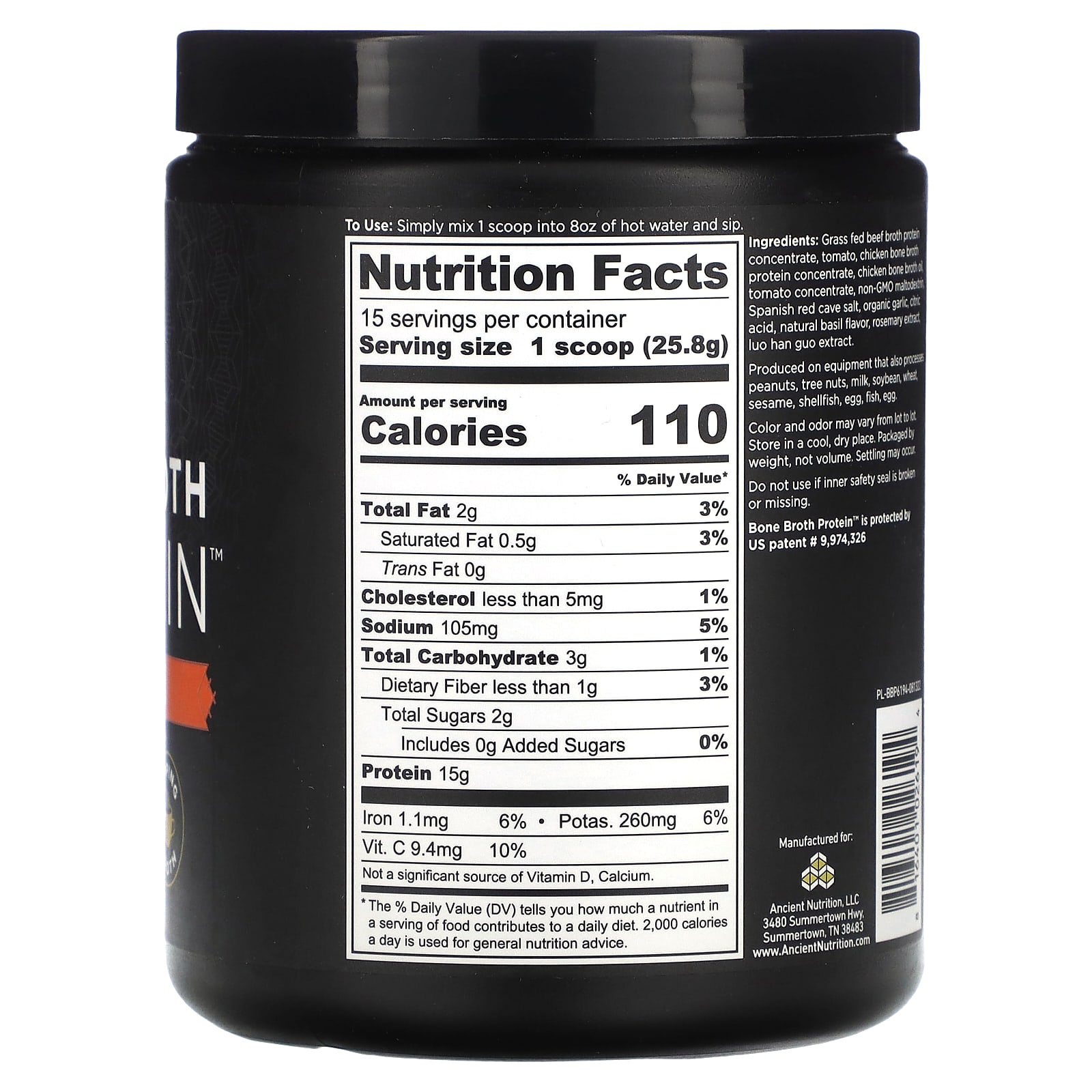 Bone Broth Protein Tomato Basil - это суперпродукт, богатый питательными веществами и содержащий 15 г белка, который идеально подходит для употребления. Эта формула не содержит обычных аллергенов.