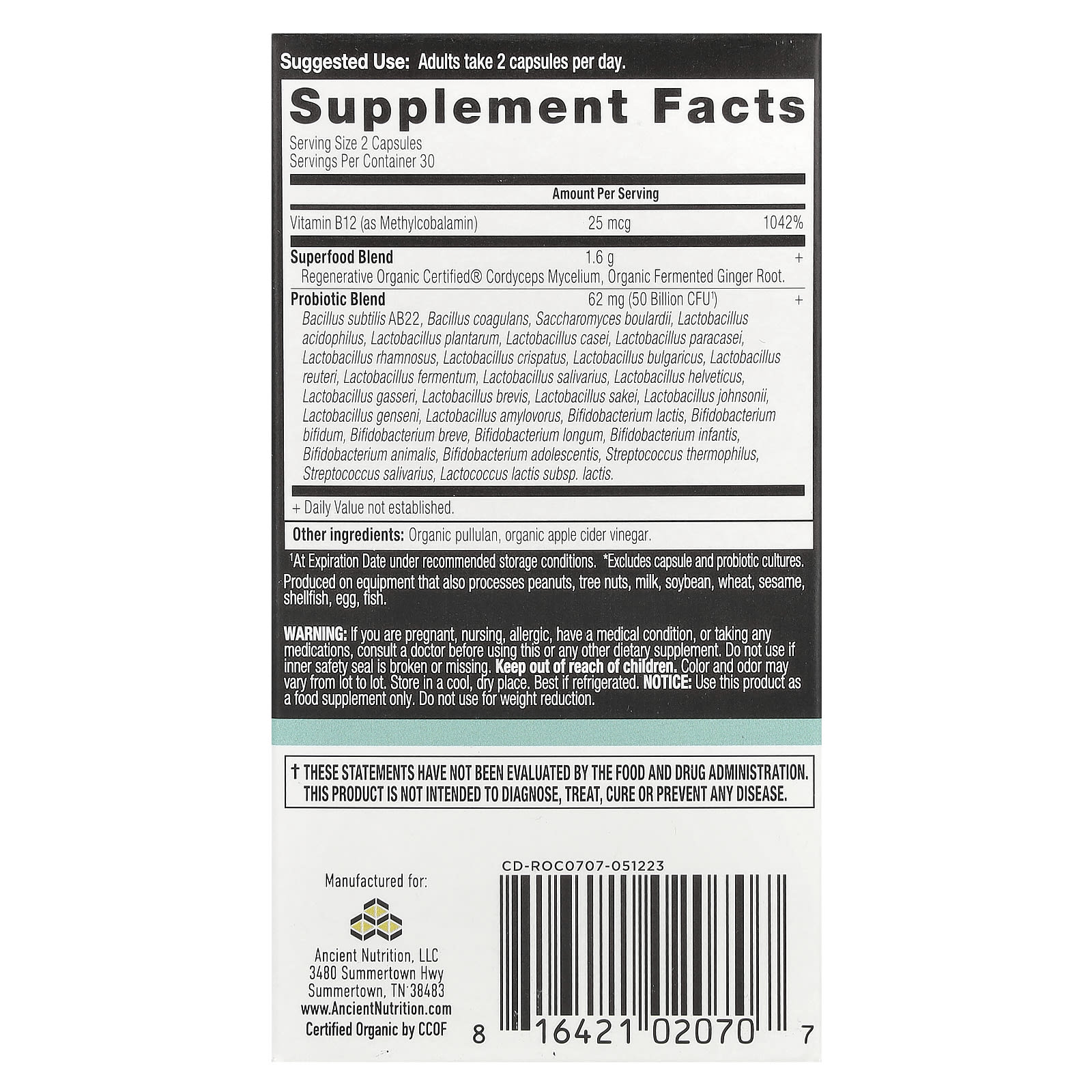 | Смесь суперфудов Regenerative Organic Certified® мицелий кордицепса, органический ферментированный корень имбиря. | 1,6 г | † |