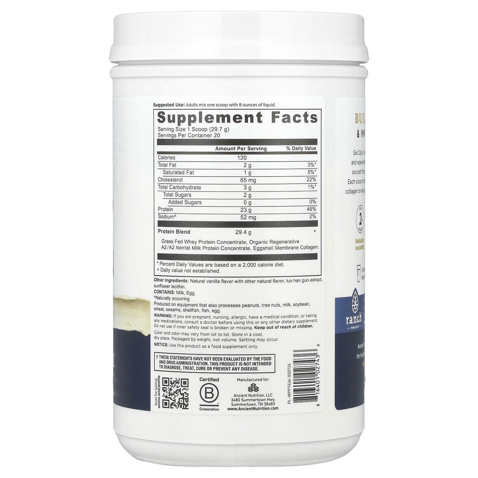 Концентрат сывороточного протеина травяного откорма, органический регенеративный концентрат обезжиренного молочного протеина A2 / A2, мембранный коллаген яичной скорлупы.