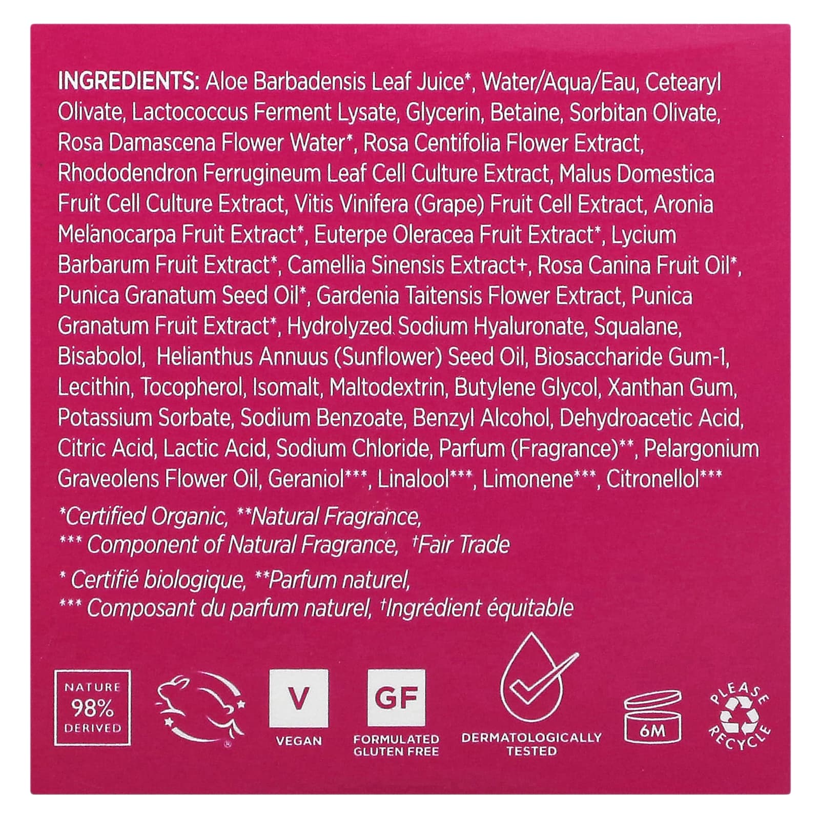 Сок листьев алоэ вера (Aloe barbadensis), вода, цетеарил оливат, лизат ферментов лактококка, глицерин, бетаин, сорбитан оливат, вода из цветков дамасской розы **, экстракт цветков розы столистной (Rosa centifolia), экстракт культуры листьев альпийской розы (Rhododendron ferrugineum), экстракт культуры клеток плодов яблони домашней (Malus domestica), экстракт клеток плодов винограда (Vitis vinifera), экстракт плодов аронии меланокарпа '', экстракт плодов Euterpe oleracea ', экстракт ягод годжи (Lycium barbarum), экстракт камелии китайской, масло плодов роза (Rosa canina) *, масло семян граната (Punica granatum) *, экстракт цветков гардении таитенсис, экстракт плодов граната (Punica granatum), гидролизованный гиалуронат натрия, сквалан, бисаболол, масло подсолнечное (Helianthus annuus), биосахаридная смола-1, лецитин, токоферол, изомальт, мальтодекстрин, бутиленгликоль, ксантановая камедь, сорбат калия, бензоат натрия, бензиловый спирт, дегидроуксусная кислота, лимонная кислота, молочная кислота, хлорид натрия, парфюмерная композиция (отдушка) **, масло из цветков герани (Pelargonium graveolens), гераниол ***, linalool***, лимонен ***, citronellol***.