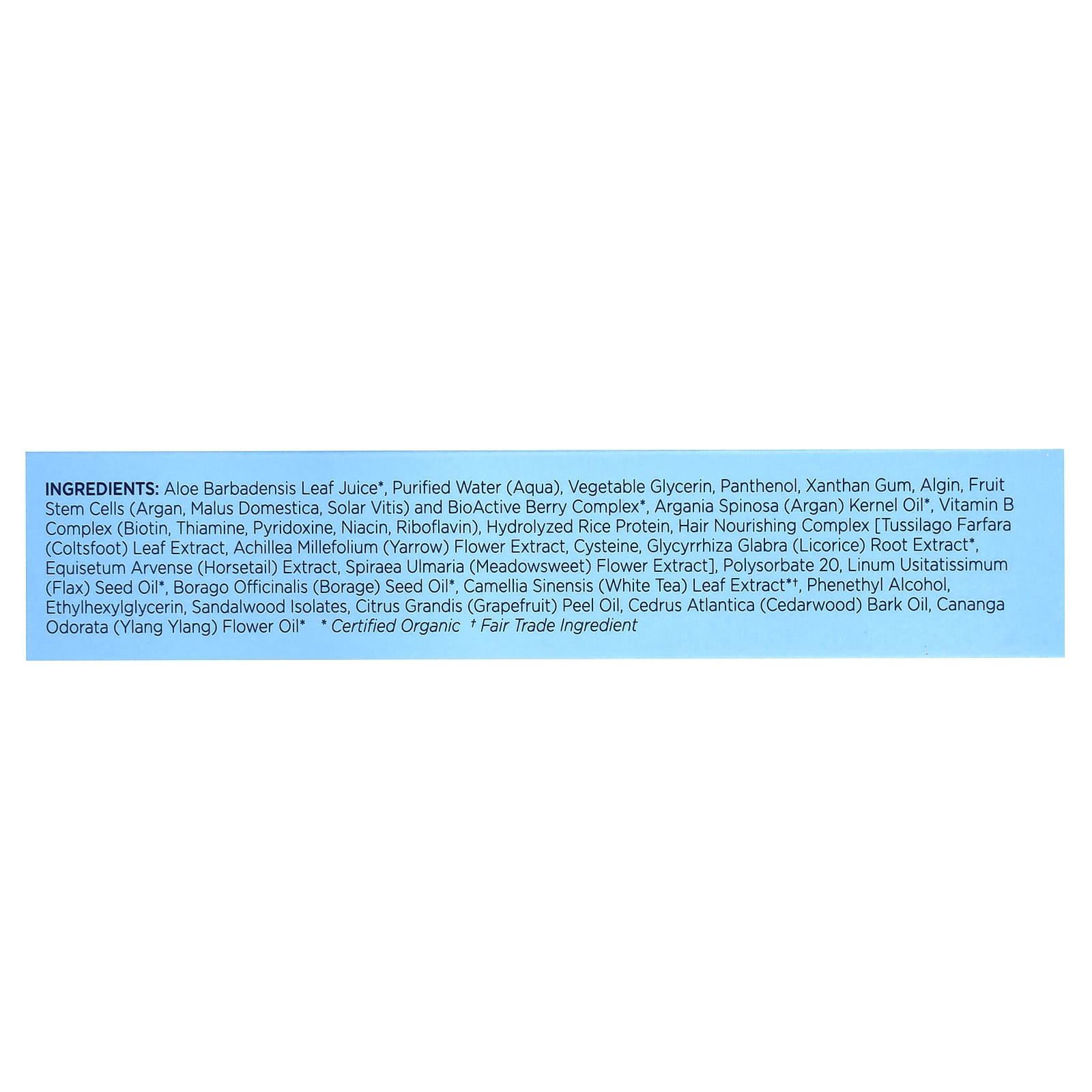 Сок листьев алоэ вера (Aloe barbadensis)*, очищенная вода (Aqua), растительный глицерин, пантенол, ксантановая камедь, альгинат натрия (альгин), стволовые клетки плодов [арганы, яблони домашней (Malus domestica), винограда (Solar vitis)] и биоактивный комплекс из 8 ягод*, масло из косточек арганы (Argania spinosa)*, комплекс витаминов группы B (биотин, тиамин, пиридоксин, ниацин, рибофлавин), гидролизованный рисовый протеин, комплекс для восстановления волос [экстракт листьев мать-и-мачехи (Tussilago farfara), экстракт цветков тысячелистника (Achillea millefolium), цистеин, экстракт корня солодки (Glycyrrhiza glabra)*, экстракт хвоща полевого (Equisetum arvense), экстракт цветков таволги (Spiraea ulmaria)], гидролизованный соевый протеин, полисорбат 20, масло из семян льна (Linum usitatissimum)*, масло из семян бурачника (Borago officinalis)*, экстракт листьев белого чая (Camellia sinensis)*†, экстракт цветков розеллы (Hibiscus sabdariffa)*†, фенетиловый спирт, этилгексилглицерин, изоляты сандалового дерева, масло из кожуры грейпфрута (Citrus grandis), масло коры кедра атласского (Cedrus atlantica), масло из цветков иланг-иланга (Cananga odorata)*