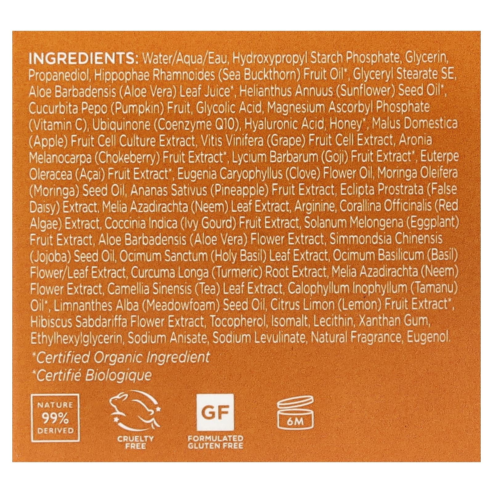 Вода (eau), гидроксипропил фосфат крахмала, глицерин, пропандиол, масло плодов облепихи (Hippophae rhamnoides)*, глицерил стеарат эмульгирующий, сок листьев алоэ вера (Aloe barbadensis)*, подсолнечное масло (Helianthus annuus)*, плоды тыквы (Cucurbita pepo), гликолевая кислота, аскорбилфосфат магния (витамин C), убихинон (коэнзим Q10), гиалуроновая кислота, мед*, экстракт культуры клеток плодов яблони домашней (Malus domestica), экстракт клеток плодов винограда (Vitis vinifera), экстракт плодов аронии (Aronia melanocarpa)*, экстракт ягод годжи (Lycium barbarum)*, экстракт ягод асаи (Euterpe oleracea)*, масло из цветков гвоздичного дерева (Eugenia caryophyllus), масло из семян моринги (Moringa oleifera), экстракт плодов ананаса (Ananas sativus), экстракт эклипты простертой (Eclipta prostrata), экстракт листьев нима (Melia azadirachta), аргинин, экстракт красных водорослей (Corallina officinalis), экстракт плодов плюща (Coccina indica), экстракт плодов баклажана (Solanum melongena), экстракт цветков алоэ вера (Aloe barbadensis), масло из семян жожоба (Simmondsia chinensis), экстракт листьев базилика священного (Ocimum sanctum), экстракт цветков и листьев базилика священного (Ocimum basilicum), экстракт корня куркумы (Curcuma longa), экстракт цветков нима (Melia azadirachta), экстракт листьев зелёного чая (Camellia sinensis), масло таману (Calophyllum inophyllum)*, масло из семян пенника лугового (Limnanthes alba), экстракт плодов лимона (Citrus limon)*, экстракт цветков розеллы (Hibiscus sabdariffa), токоферол, изомальт, лецитин, ксантановая камедь, этилгексилглицерин, анисат натрия, левулинат натрия, натуральный ароматизатор, эвгенол.