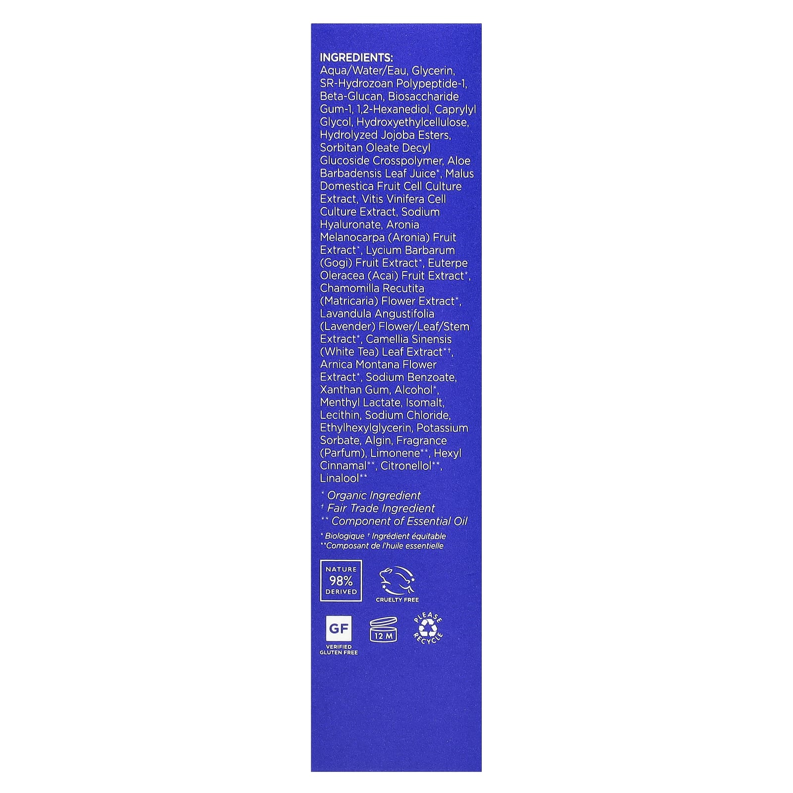 Вода, глицерин, SR-гидрозоан полипептид-1, бета-глюкан, биосахаридная смола-1, 1,2-гександиол, каприлилгликоль, гидроксиэтилцеллюлоза, гидролизованные эфиры жожоба, децил глюкозида сорбитанолеата кроссполимер, сок листьев алоэ вера (Aloe barbadensis)*, экстракт культуры клеток плодов яблони домашней (Malus domestica), экстракт культуры клеток винограда культурного (Vitis vinifera), гиалуронат натрия, экстракт ягод черноплодной рябины (Aronia melanocarpa)*, экстракт ягод годжи (Lycium barbarum)*, экстракт ягод асаи (Euterpe oleracea)*, экстракт цветков ромашки (Chamomilla recutita)*, экстракт цветков/листьев/стеблей лаванды (Lavandula angustifolia)*, экстракт листьев белого чая (Camellia sinensis)*†, экстракт цветков арники (Arnica montana)*, бензоат натрия, ксантановая камедь, спирт*, ментил лактат, изомальт, лецитин, хлорид натрия, этилгексилглицерин, сорбат калия, альгин, отдушка, лимонен**, гексил циннамал**, цитронеллол**, линалоол**.