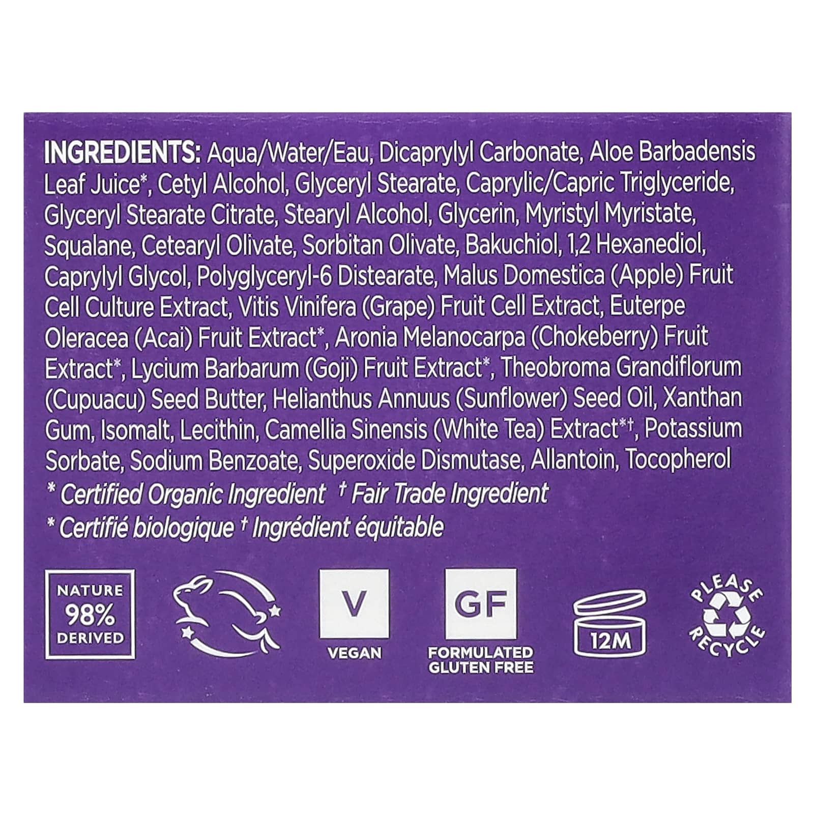 Вода (Aqua/eau), дикаприлил карбонат, сок листьев алоэ вера *, цетиловый спирт, глицерил стеарат, каприловый/каприновый триглицерид, глицерил стеарат цитрат, стеариловый спирт, глицерин, миристил миристат, сквалан, цетеарил оливат, сорбитан оливат, бакучиол, 1,2-гександиол, каприлилгликоль, полиглицерил-6 дистеарат, экстракт культуры клеток плодов яблони домашней (Malus domestica), экстракт клеток плодов винограда (Vitis vinifera), экстракт плодов асаи (Euterpe oleracea) *, экстракт плодов аронии (Aronia melanocarpa) *, экстракт плодов годжи (Lycium barbarum) *, масло семян купуасу (theobroma grandiflorum), подсолнечное масло (Helianthus annuus), ксантановая камедь, изомальт, лецитин, экстракт белого чая (Camellia sinensis) * †, сорбат калия, бензоат натрия, СОД, аллантоин, токоферол.