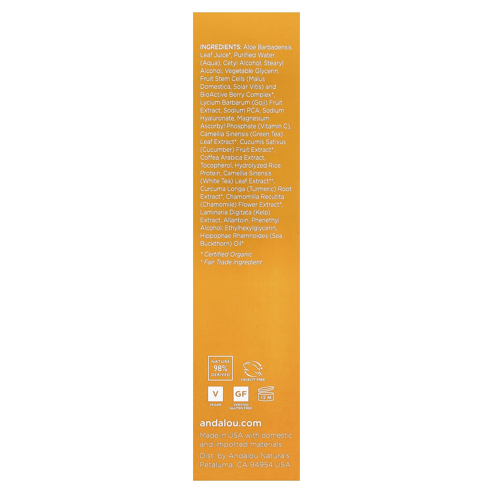 Сок листьев алоэ вера (Aloe barbadensis)*, очищенная вода (Aqua), цетиловый спирт, стеариловый спирт, растительный глицерин, стволовые клетки плодов (яблони садовой [Malus domestica], винограда [Solar vitis]), биоактивный комплекс ягод*, экстракт плодов годжи (Lycium barbarum), натрия пирролидонкарбонат, гиалуронат натрия, аскорбил фосфат магния (витамин C), экстракт листьев зеленого чая (Camellia sinensis)*, экстракт плодов огурца (Cucumis sativus)*, экстракт кофе арабика, токоферол, гидролизованный рисовый протеин, экстракт листьев белого чая (Camellia sinensis)*†, экстракт корня куркумы (Curcuma longa)*, экстракт цветков ромашки (Chamomilla recutita)*, экстракт ламинарии (Luminaria digitata), аллантоин, фенетиловый спирт, этилгексилглицерин, облепиховое масло (Hippophae rhamnoides)*.