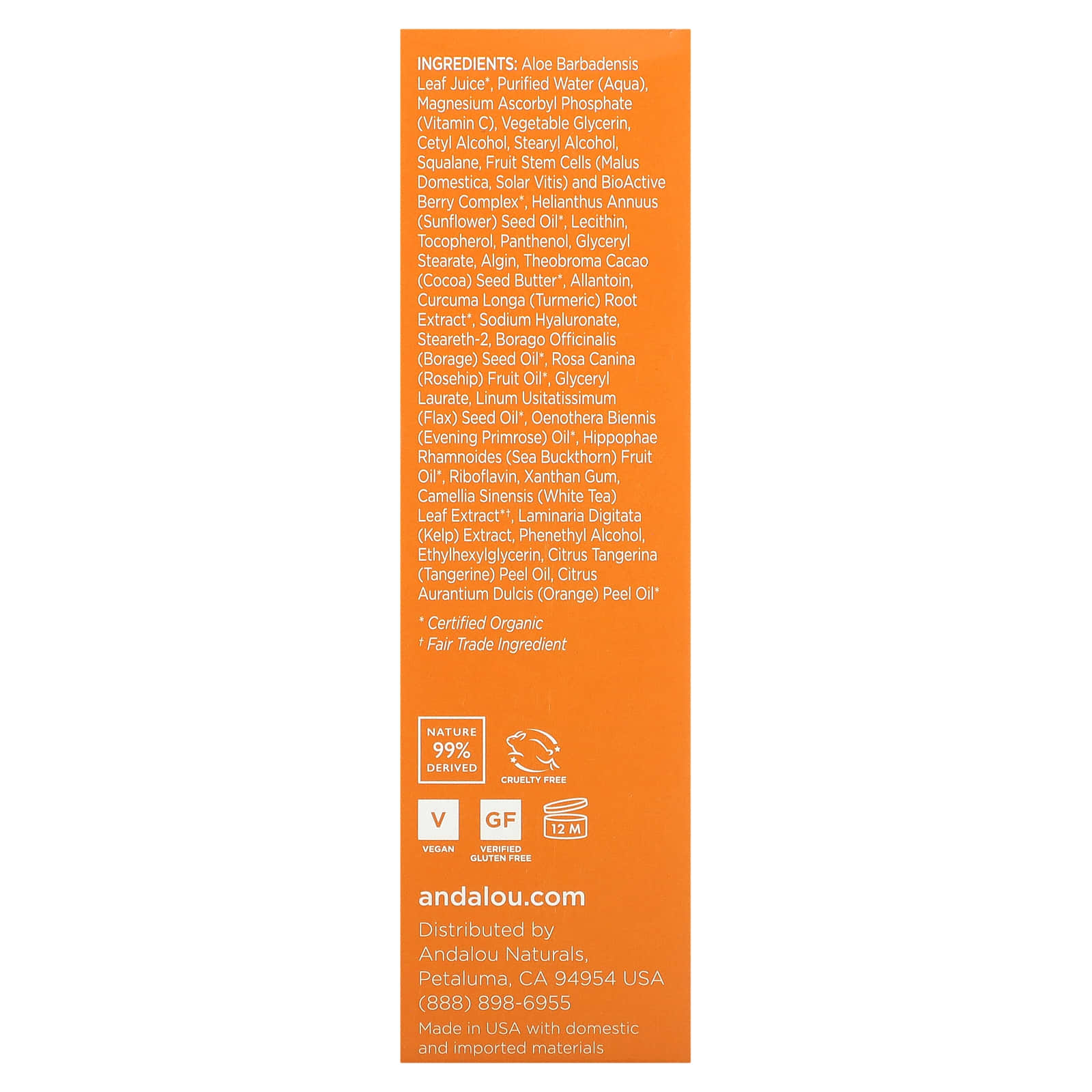 Сок алоэ вера (Aloe barbadensis)*, подсолнечное масло (Helianthus annuus)*, глицерин (растительного происхождения), гуаровая камедь (Cyamopsis tetragonolobus), стволовые клетки плодов яблони домашней (Malus domestica), винограда (Solar vitis) и биоактивный комплекс из 8 ягод*, экстракт куркумы (Curcuma longa)*, аскорбилфосфат магния (витамин C), токоферол (витамин E), лауриновая кислота, цетеариловый спирт, гиалуроновая кислота, полифенолы виноградных косточек (Vitis vinifera), масла огуречника (Borago officinalis) и шиповника (Rosa canina)*, глицерил монолаурат, лен (Linum usitatissiumum), масла примулы вечерней (Oenothera biennis) и облепихи (Hippophae rhamnoides)*, экстракт белого чая (Camellia sinensis)*†, порошок из экстракта бурых водорослей (Laminaria digitata), аллантоин, цетиловый спирт, глицерил стеарат, фенетиловый спирт, этилгексилглицерин, масло апельсина (Citrus aurantium dulcis)*