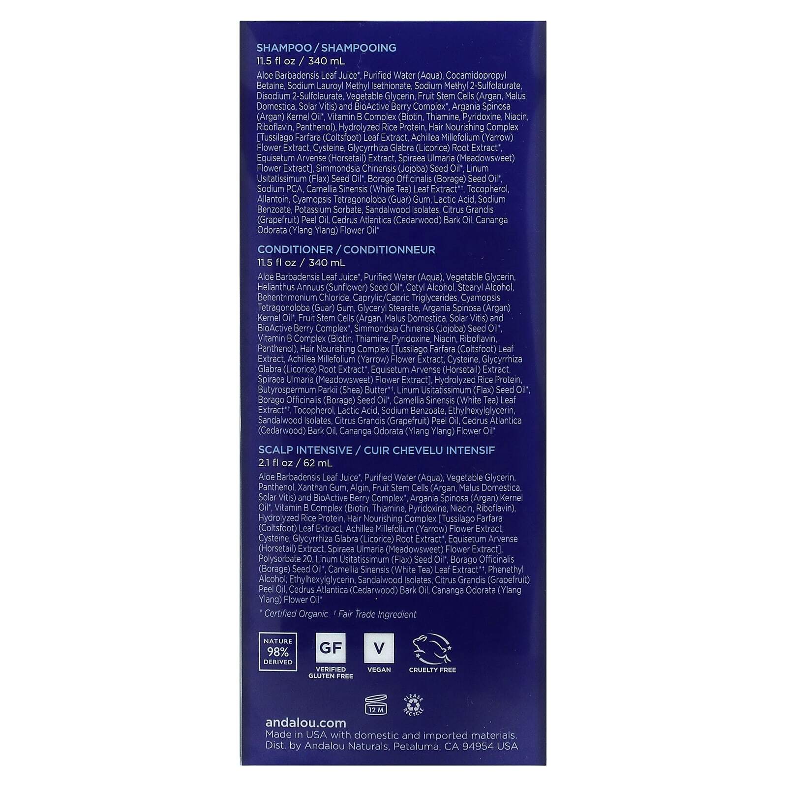 Aloe Barbadensis Leaf Juice *, очищенная вода (Aqua), лауроил-саркозинат натрия, кокамидопропилбетаин, сульфонат олефина натрия, растительный глицерин, фруктовые стволовые клетки (Argan, Malus Domestica, Solar Vitis) и BioActive 8 Berry Complex *, Argania Spinosa (Argan) Kernel Oil *, комплекс витамина B (биотин, тиамин, пиридоксин, ниацин, рибофлавин, пантенол), гидролизованный белок риса, комплекс регенерации волос [Экстракт лисицы Tussilago Farfara (Coltsfoot), экстракт цветов Achillea Millefolium (Yarrow), цистеин, Glycyrrhiza Glabra ( Солодка), экстракт корневого экстракта *, экстракт Equisetum Arvense (экстракт хвоща), экстракт цветов Spiraea Ulmaria (Meadowsweet), гидролизованный соевый белок, масло семян Simmondsia Chinensis (жожоба) *, масло семян Linum Usitatissimum (льна) *, семена Borago Officinalis (Borage) Масло *, Amodimethicone, экстракт листьев камелии Sinensis (белый чай) *, экстракт цветов Hibiscus Sabdariffa *, токоферол, аллантоин, поликватерний 10, бензоат натрия, молочная кислота, сорбат калия, этилгексилглицерин, санда Lwood Isolates, Citrus Grandis (грейпфрут) Пиль-масло, Cedrus Atlantica (Cedarwood) Масло коры, Cananga Odorata (Ylang Ylang) Цветочное масло *
