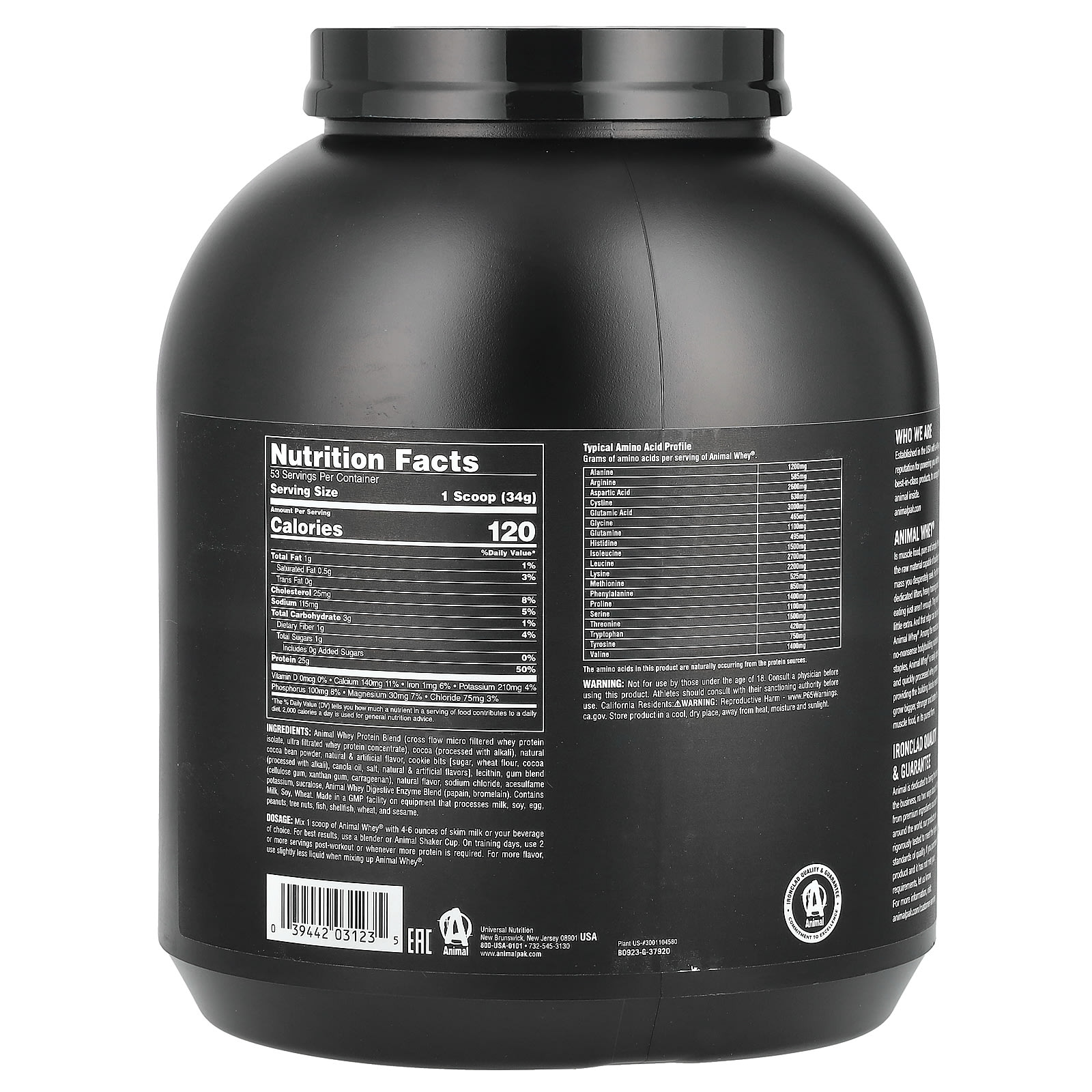 Смесь животного изолята сывороточного протеина™ [микро-фильтрованный поперечным потоком изолят сывороточного протеина, фильтрованный концентрат сывороточного протеина (молоко)], какао, натуральный искусственных шоколадных ароматизаторов (сульфитов), кусочки печенья [сахар, пшеничная мука, какао (обработанное щелочью), масло канолы, соль, натуральный искусственных ароматизаторов], лецитин (из сои), смесь камеди (целлюлозная камедь, ксантановая камедь, каррагинан), хлорид натрия, ацесульфам калия, сукралоза, смесь пищеварительных ферментов сывороточного протеина Animal изолят сывороточного протеина (папаин, бромелаин).