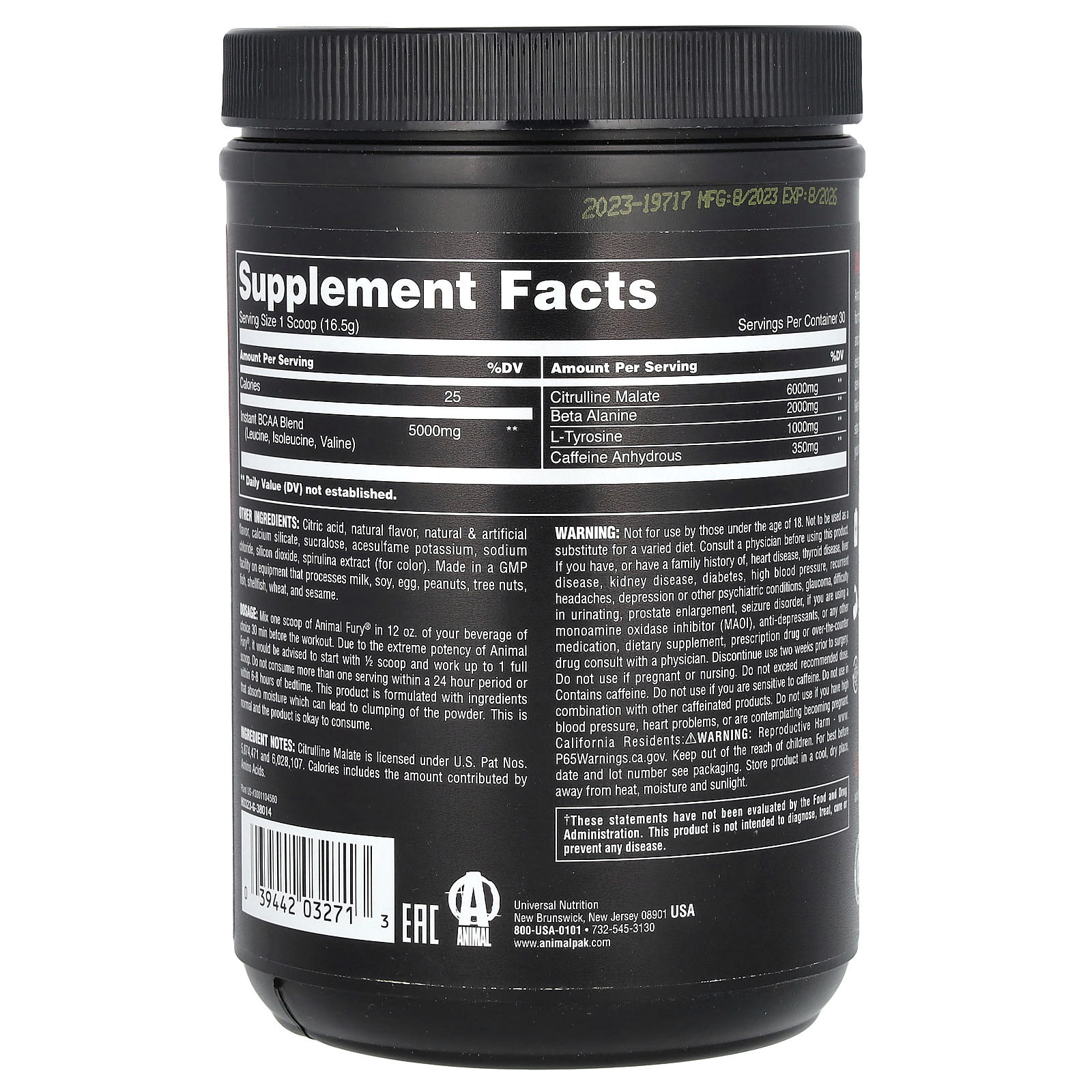 Смешайте одну мерную ложку Animal Fury с 12 унциями. напитка по вашему выбору за 30 минут до тренировки. Из-за сильной активности животного гнева рекомендуется начинать с 1/2 мерной ложки и доводить до 1 полной мерной ложки. Не употребляйте более одной порции в течение 24 часов и в течение 6–8 часов перед сном. В состав этого продукта входят ингредиенты, которые впитывают влагу, что может привести к образованию комков в порошке. Это нормально и продукт годится к употреблению.