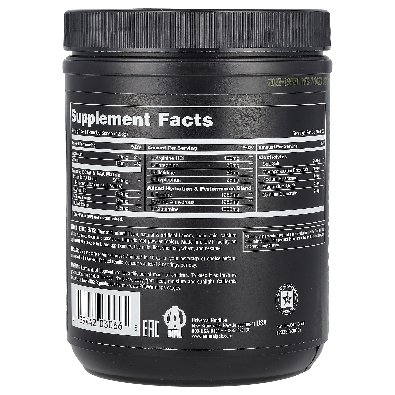 Смешайте одну мерную ложку Animal Juiced Aminos® с 300 мл (10 унций). напитка до, во время или после тренировки. Для достижения наилучших результатов употребляйте не менее 2 порций в день.