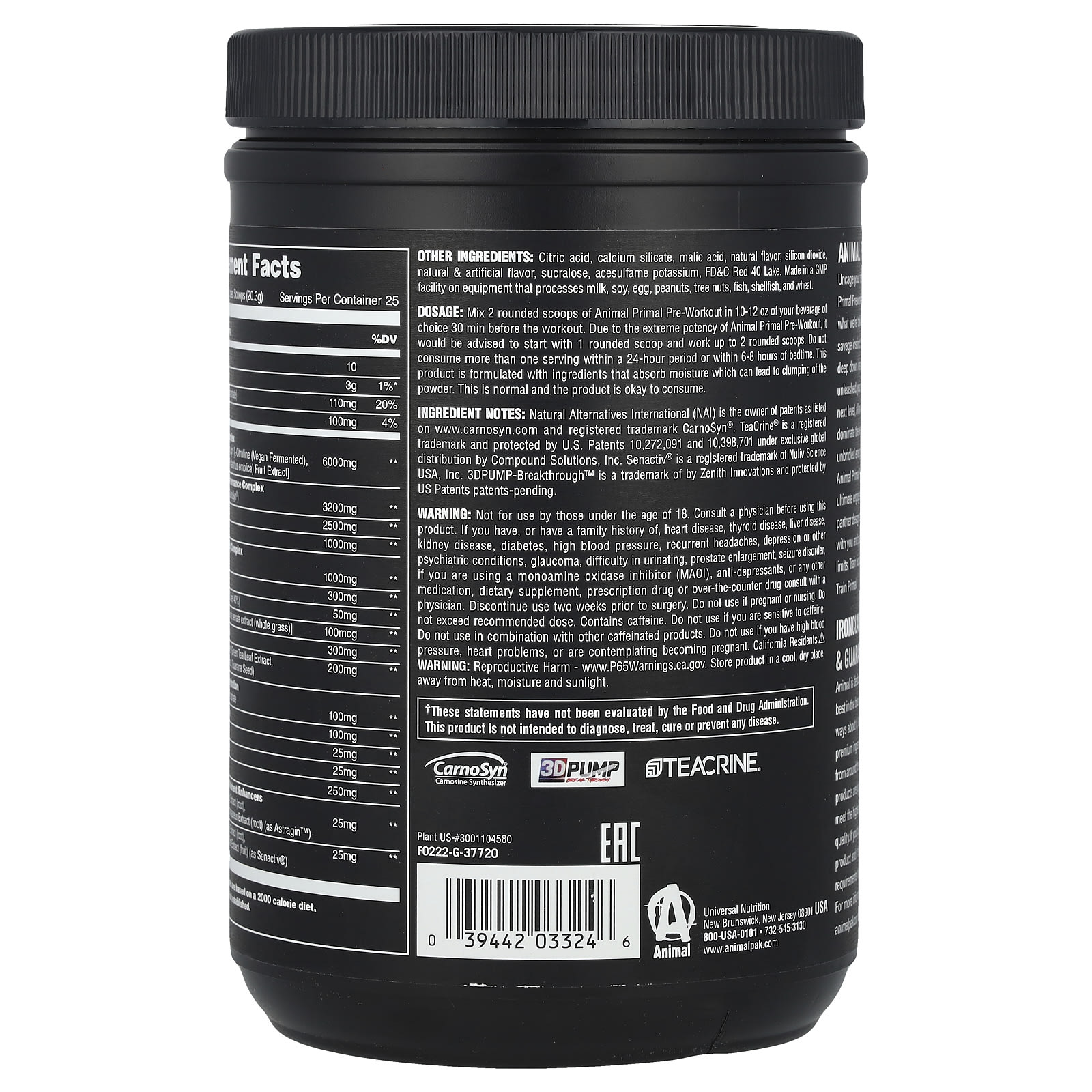 Смешайте 2 мерные ложки предтренировочного средства Animal Primal с 10–12 унциями напитка по вашему выбору за 30 минут до тренировки. Из-за максимальной эффективности предтренировочного средства Animal Primal рекомендуется начинать с 1 мерной ложки с горкой и доводить до 2 мерных ложек с горкой. Не употребляйте более одной порции в течение 24 часов или в течение 6–8 часов перед сном. В состав этого продукта входят ингредиенты, которые впитывают влагу, что может привести к слипанию порошка. Это нормально и продукт годится к употреблению.