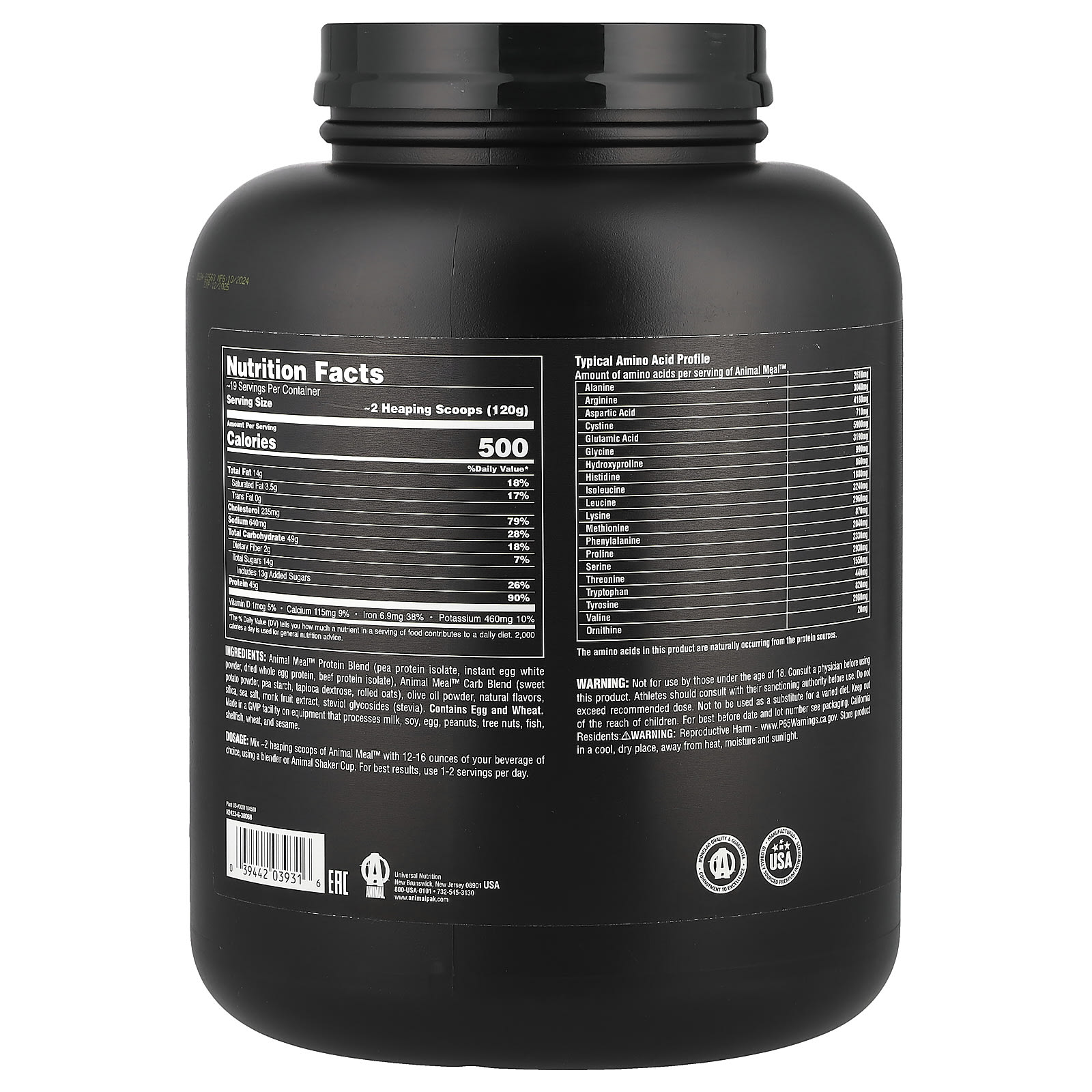 Протеиновая смесь Animal Meal ™ (изолят горохового протеина, быстрорастворимый яичный белок, сушеный цельный яичный белок, изолят говяжьего белка), Animal Meal ™ Carb Blend (порошок из батата, гороховый крахмал, тапиоковая декстроза, овсяные хлопья), порошок из оливкового масла, натуральные ароматизаторы, диоксид кремния, морская соль, экстракт архата, стевиолгликозиды (стевия).