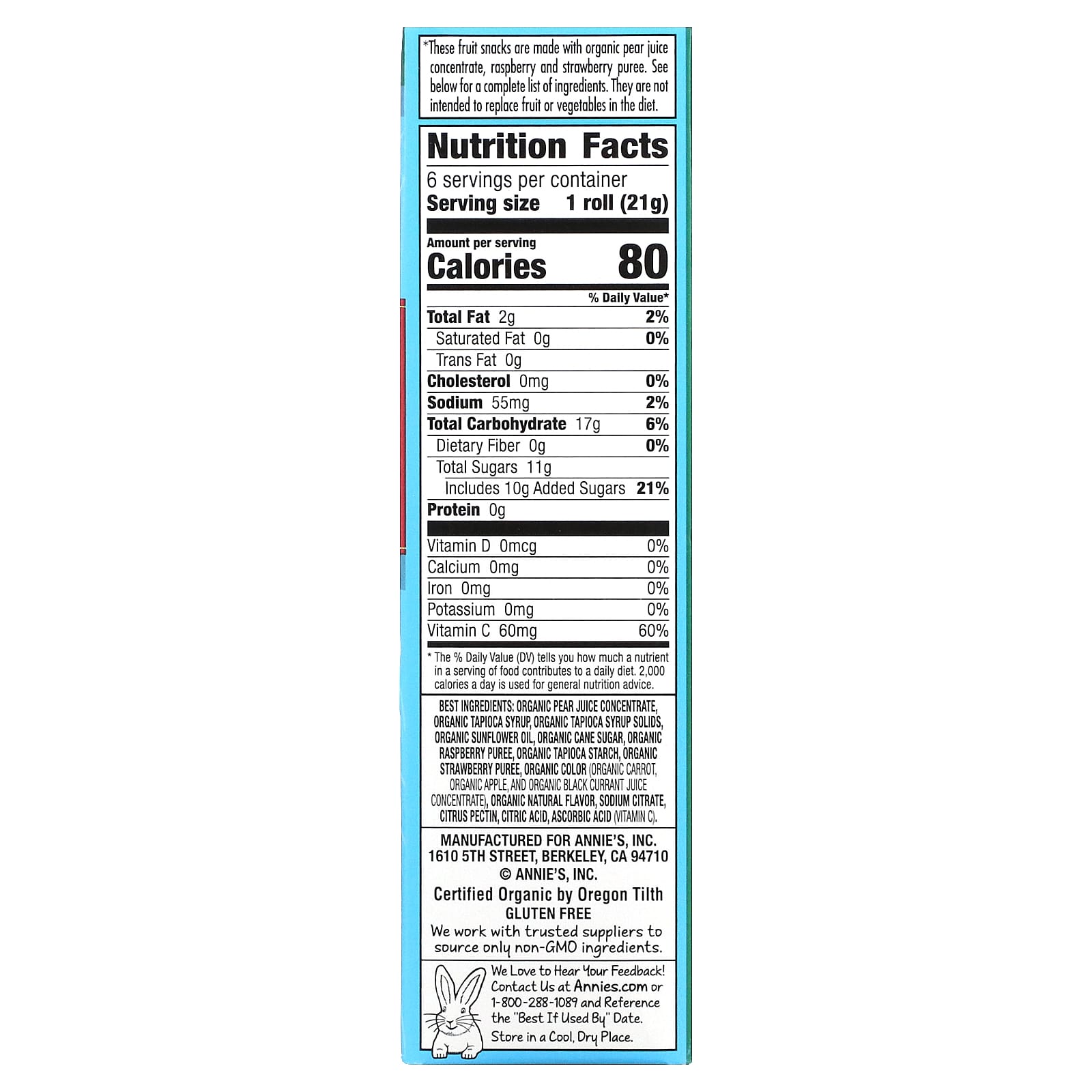 Концентрат органического грушевого сока, органический тапиоковый сироп, сухие вещества органического тапиокового сиропа, органическое подсолнечное масло, органический тростниковый сахар, органическое малиновое пюре, органический тапиоковый крахмал, органическое клубничное пюре, органический краситель (органическая морковь, органическое яблоко, органический концентрат сока черной смородины), органический натуральный ароматизатор, цитрат натрия, цитрусовый пектин, лимонная кислота, аскорбиновая кислота (витамин C).