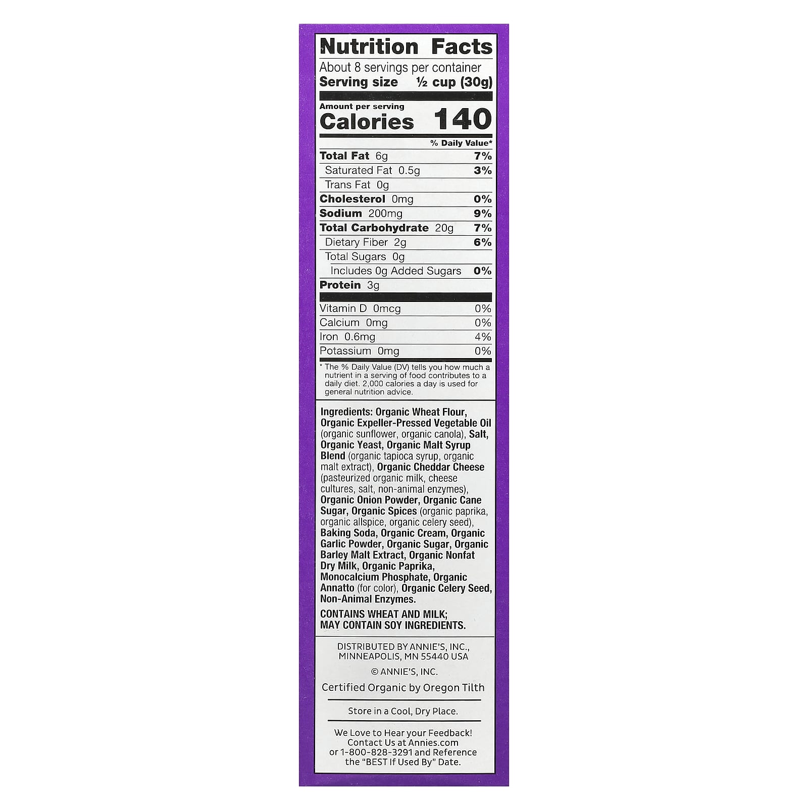 Органическая пшеничная мука, растительное масло органического отжима (органическое подсолнечное, органический рапс), соль, органические дрожжи, смесь органического солодового сиропа (органический тапиоковый сироп, органический солодовый экстракт), органический сыр чеддер (пастеризованное органическое молоко, сырные культуры, соль, ферменты неживотного происхождения), органический луковый порошок, органический тростниковый сахар, органические специи (органический перец, органический душистый перец, органические семена сельдерея), пищевая сода, органический крем, органический чесночный порошок, органический сахар, экстракт органического ячменного солода, органическое обезжиренное сухое молоко, органическая паприка, монокальций фосфат, органические аннато (для цвета), органические семена сельдерея, ферменты неживотного происхождения.