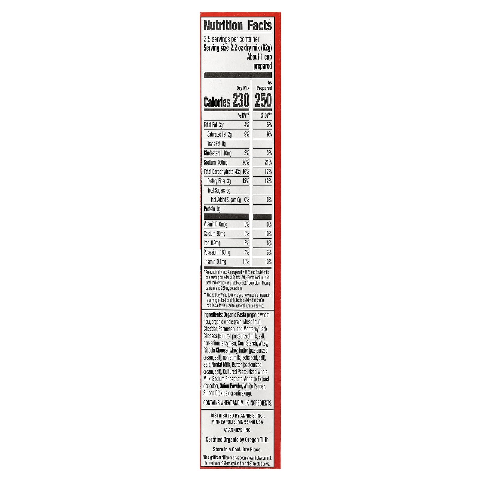 Органические макароны (органическая пшеничная мука, органическая цельнозерновая пшеничная мука), чеддер, пармезан, сыр Монтерей джек (кислородное пастеризованное молоко, соль, ферменты неживотного происхождения), кукурузный крахмал, сыворотка, сыр рикотта (сыворотка, масло (пастеризованные сливки, соль, обезжиренное молоко, молочная кислота, соль), соль, обезжиренное молоко, масло (пастеризованные сливки, соль), сквашенное пастеризованное цельное молоко, фосфат натрия, экстракт аннато (краситель), луковый порошок, белый перец, диоксид кремния (предотвращает слеживание).