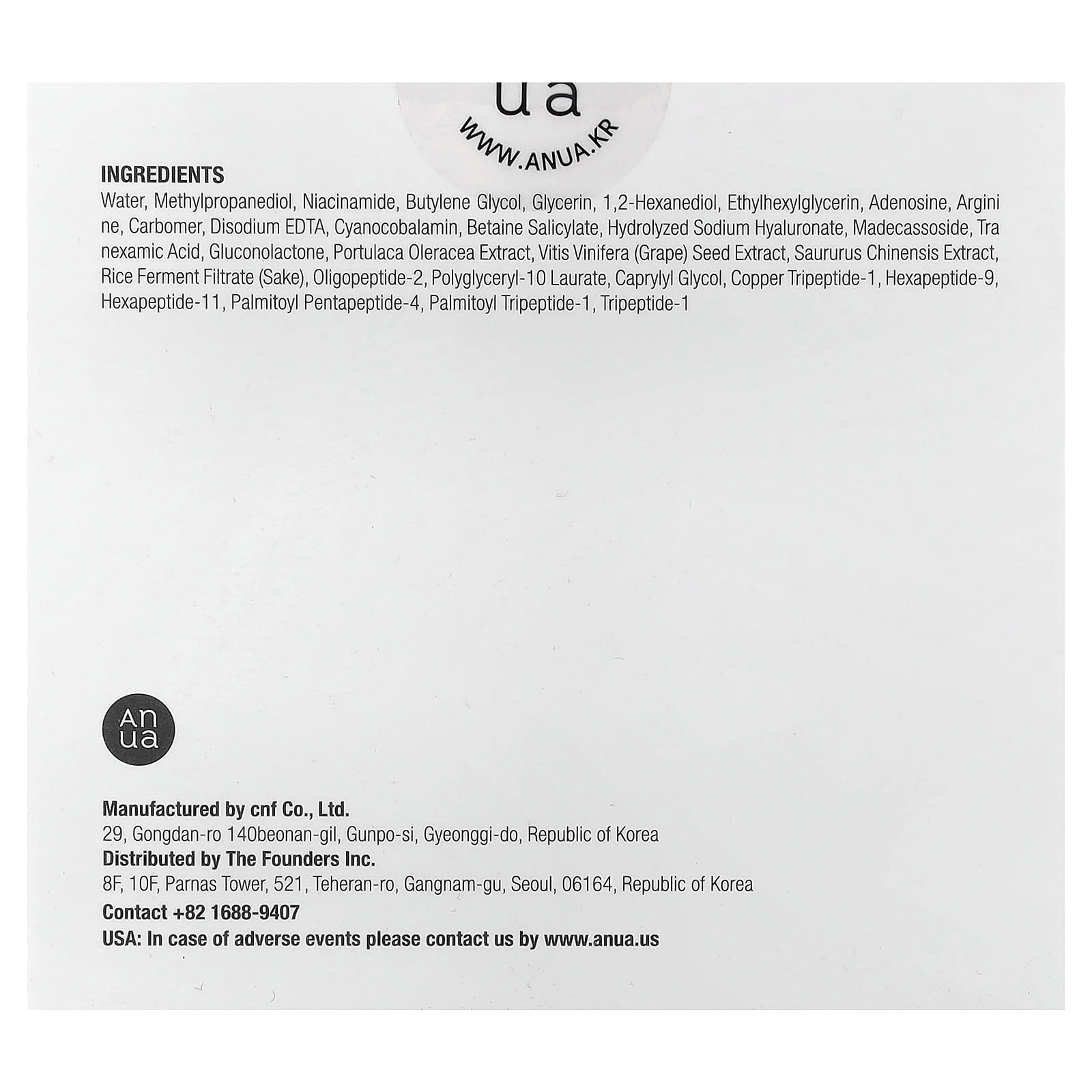 вода, метилпропандиол, никотинамид, бутиленгликоль, глицерин, 1,2-гександиол, этилгексилглицерин, аденозин, аргинин, карбомер, двунатриевая ЭДТК, цианокобаламин, бетаин салицилат, гидролизованный гиалуронат натрия, мадекассосид, транексамовая кислота, глюконолактон, экстракт портулака огородного (Portulaca oleracea), экстракт виноградных косточек (Vitis vinifera), экстракт сычуаньского перца (Saururus chinensis), продукт ферментации риса (саке), олигопептид-2, полиглицерил-10 лаурат, каприлилгликоль, меди трипептид-1, гексапептид-9, гексапептид-11, пальмитоил пентапептид-4, пальмитоил трипептид-1, трипептид-1.