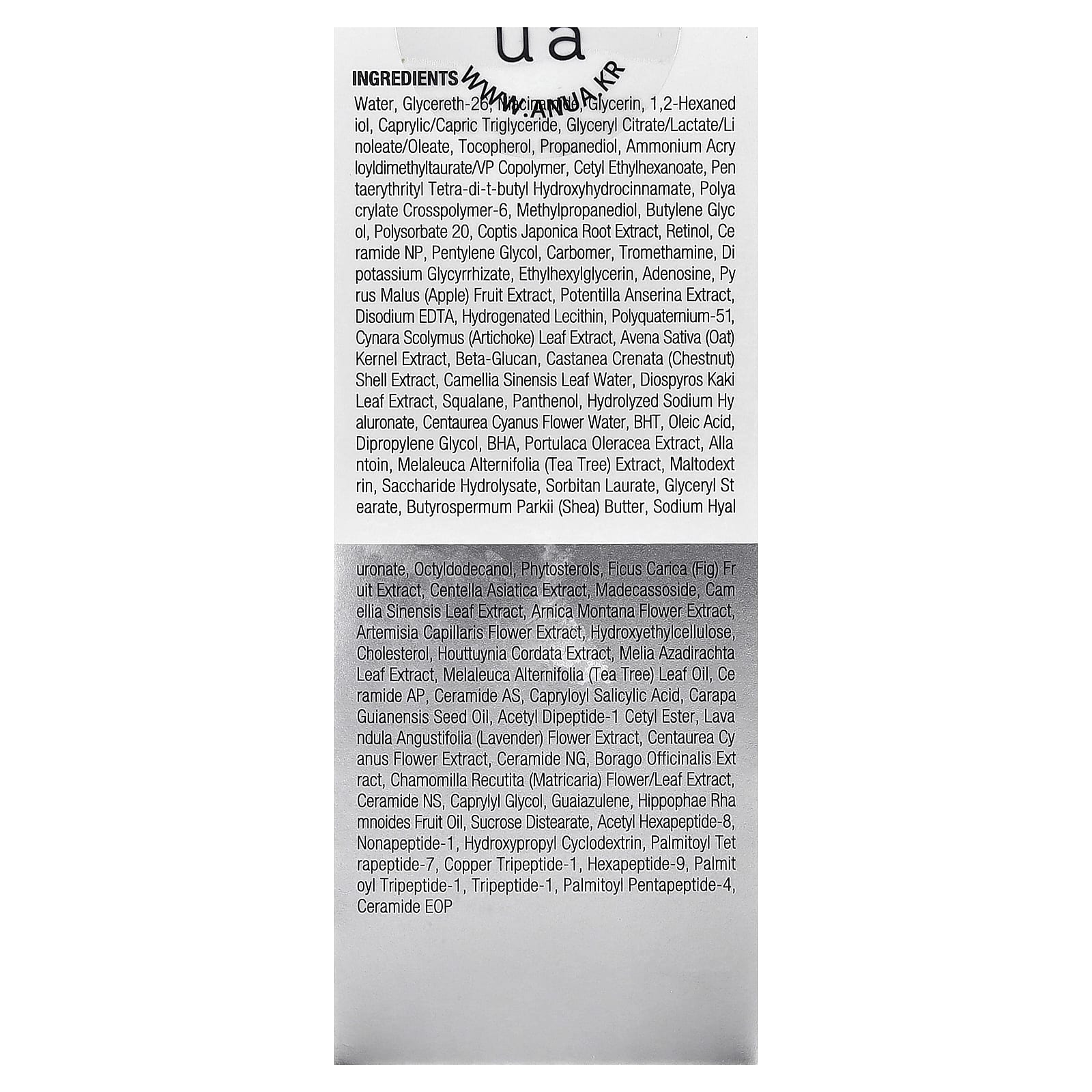 Вода, глицерет-26, Ниацинамид, глицерин, 1,2-гександиол, каприловый/каприновый триглицерид, глицерил цитрат/лактат/линолеат/олеат, Токоферол, пропандиол, аммоний акрилоилдиметилтаурат/ВП сополимер, цетилэтилгексаноат, пентаэритритил тетра-ди-т-бутилгидроксициннамат, полиакрилатный кроссполимер-6, метилпропандиол, бутиленгликоль, полисорбат 20, экстракт корня коптиса японского (Coptis japonica), ретинол, Керамид NP, пентиленгликоль, Карбомер, трометамин, глицирризат дикалия, этилгексилглицерин, аденозин, экстракт яблока (Pyrus malus), экстракт лапчатки ( Potentilla anserina), Динатрия ЭДТА, Гидрогенизированный лецитин, поликватерниум-51, экстракт листьев артишока (Cynara scolymus), экстракт ядер овса (Avena sativa), бета-глюкан, экстракт скорлупы каштана (castanea crenata), вода из листьев зеленого чая (Camellia sinensis), экстракт листьев хурмы восточной (Diospyros kaki), сквалан, пантенол, гидролизованный гиалуронат натрия, вода из цветков василька (Centaurea cyanus), Бат, олеиновая кислота, дипропиленгликоль, бутилоксианизола, экстракт портулака огородного, Аллантоин, экстракт чайного дерева (Melaleuca alternifolia), мальтодекстрин, гидролизат сахаридов, сорбитан лаурат, глицерил стеарат, Масло Butyrospermum parkii (Ши), гиалуронат натрия, октилдодеканол, фитостеролы, экстракт плодов инжира (Ficus carica), Экстракт центеллы азиатской, Мадекассозид, Экстракт листьев камелии китайской, Экстракт цветков арники горной, экстракт цветков полыни волосовидной (Artemisia capillaris), гидроксиэтилцеллюлоза, холестерин, экстракт хауттюйнии (Houttuynia cordata), экстракт листьев дерева ним (Melia azadirachta), масло из листьев чайного дерева (Melaleuca alternifolia), Керамид AP, Керамид в качестве, каприлоилсалициловая кислота, масло семян карапаги (Carapa guianensis), ацетил дипептид-1 цетиловый эфир, экстракт цветков лаванды (Lavandula angustifolia), экстракт цветков василька (Centaurea cyanus), керамид нг, экстракт бурачника лекарственного, экстракт цветков/листьев ромашки лекарственной (Chamomilla recutita), Керамид NS, каприлилгликоль, гвайазулен, масло из плодов облепихи крушиновидной (Hippophae rhamnoides), дистеарат сахарозы, ацетил гексапептид-8, нонапептид-1, гидроксипропил циклодекстрин, пальмитоил тетрапептид-7, трипептид меди-1, гексапептид-9, пальмитоил трипептид-1, трипептид-1, пальмитоил пентапептид-4, керамид EOP.