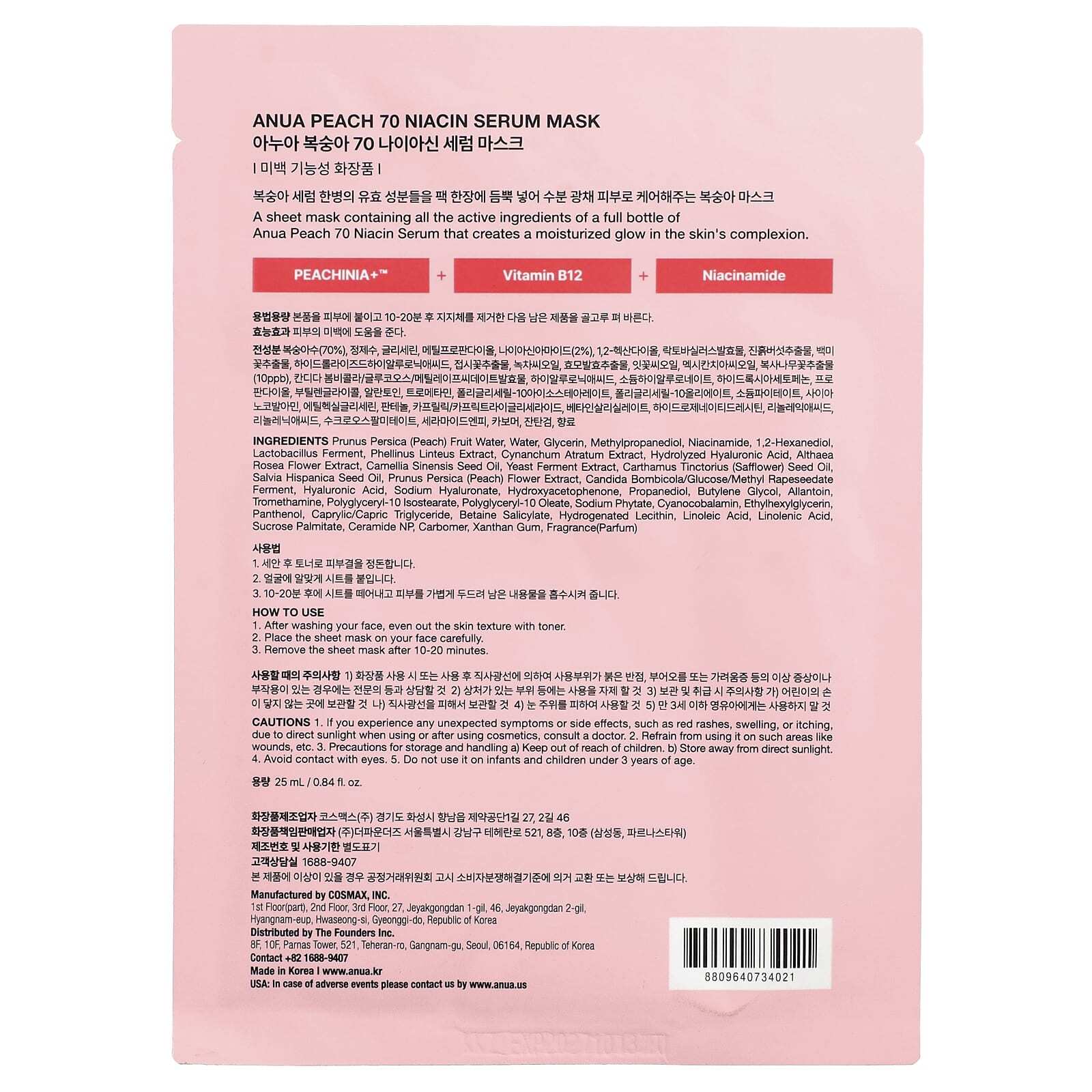 Тканевая маска, содержащая все активные ингредиенты полного флакона сыворотки с ниацином Anua Peach 70, которая придает коже сияние и увлажнение.