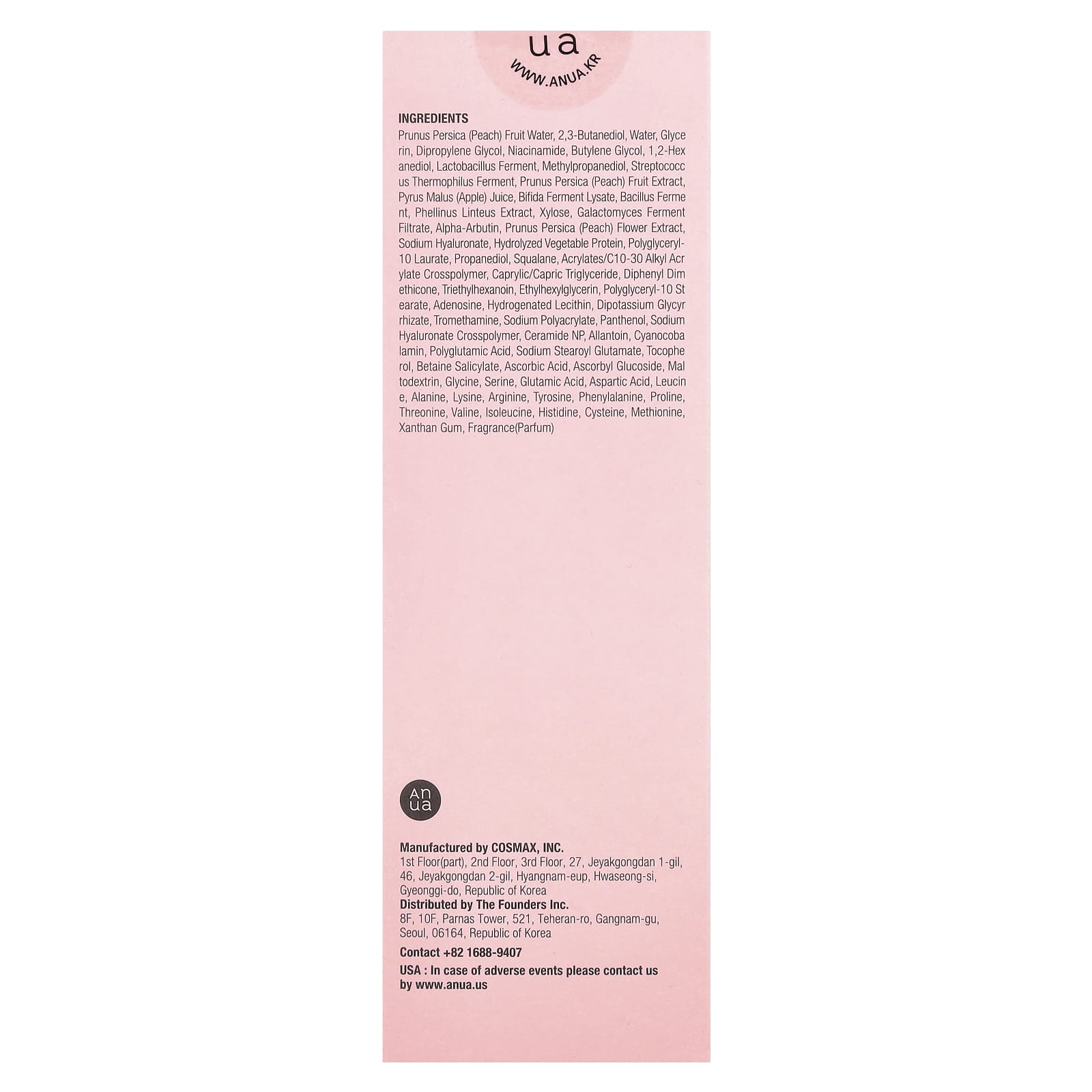 Экстракт плодов персика (Prunus persica), 2,3-бутандиол, вода, глицерин, дипропиленгликоль, никотинамид, бутиленгликоль, 1,2-гександиол, фермент лактобактерий (Lactobacillus), метилпропандиол, фермент Streptococcus thermophilus, яблочный сок (Pyrus malus), лизат ферментов бифидобактерий, бацилла, экстракт санхвана (Phellinus linteus), ксилоза, ферментированный фильтрат галактомицетов, альфа-арбутин, экстракт цветков персика (Prunus persica), гиалуронат натрия, гидролизированный растительный протеин, полиглицерил-10 лаурат, пропандиол, сквалан, акрилат/c10-30 алкил акрилат кроссполимер, каприловый/каприновый триглицерид, дифенил диметикон, триэтилгексаноин, этилгексилглицерин, поли глицерил-10 стеарат, аденозин, гидрогенизированный лецитин, дикалия глицирризат, трометамин, полиакрилат натрия, пантенол, кроссполимер гиалуроната натрия, керамид NP, аллантоин, цианокобаламин, полиглутаминовая кислота, натрия стеароил глутамат, токоферол, аскорбил глюкозид, бетаин салицилат, аскорбиновая кислота, мальтодекстрин, глицин, серин, глутаминовая кислота, аспарагиновая кислота, лейцин, аланин, лизин, аргинин, тирозин, фенилаланин, пролин, треонин, валин, изолейцин, гистидин, цистеин, метионина, ксантановая камедь, отдушка (парфюмерная композиция).