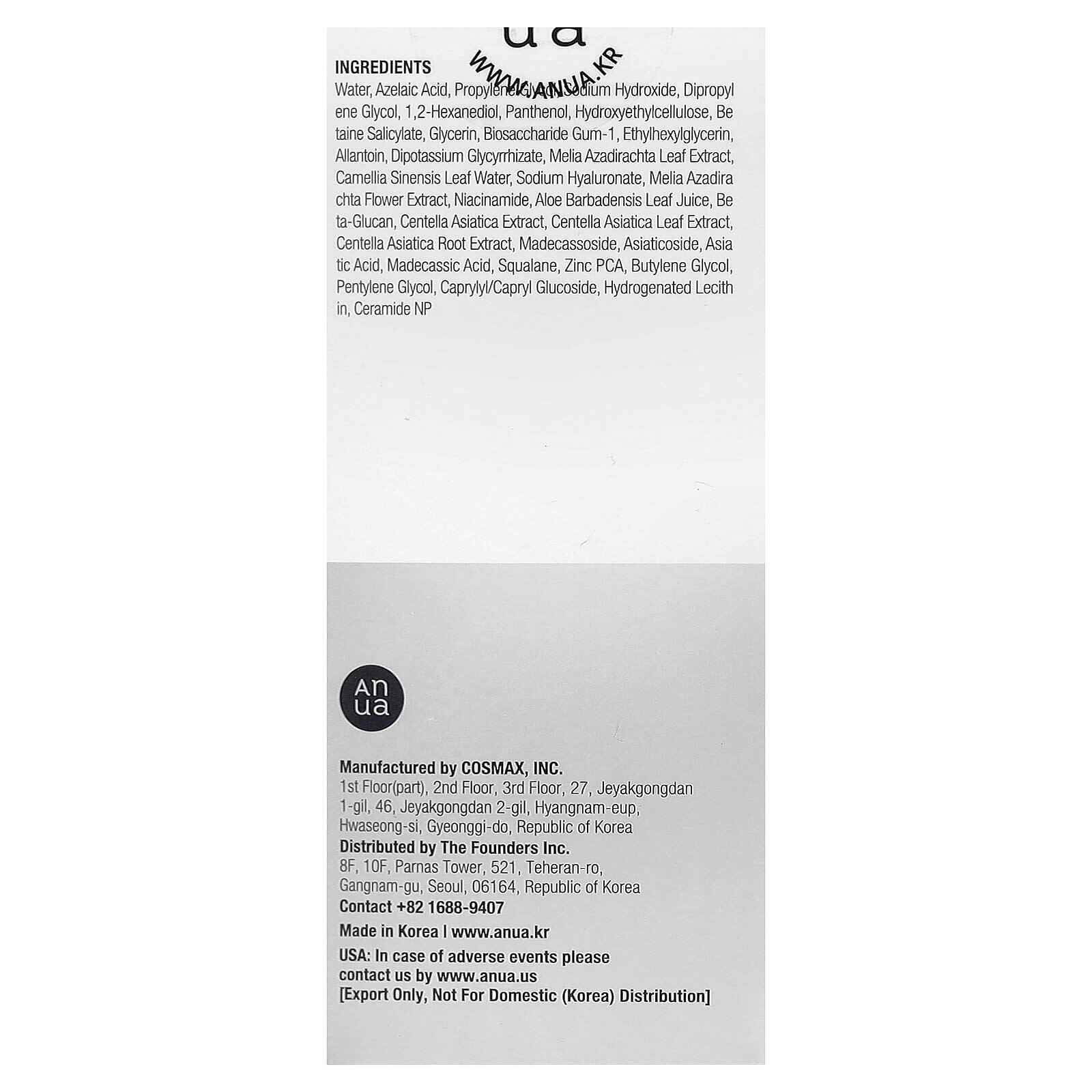Вода, азелаиновая кислота, пропилен гидроксид натрия, дипропиленгликоль, 1,2-гександиол, пантенол, гидроксиэтилцеллюлоза, бетаин салицилат, глицерин, биосахаридная смола-1, этилгексилглицерин, аллантоин, дикалия глицирризат, экстракт листьев дерева ним (Melia azadirachta), вода из листьев зеленого чая (Camellia sinensis), гиалуронат натрия, экстракт цветков дерева ним (Melia azadirachta), никотинамид, сок из листьев алоэ вера (Aloe barbadensis), бета-глюкан, экстракт готу колы (Centella asiatica), экстракт листьев готу колы (Centella asiatica), экстракт корня готу колы (Centella asiatica), мадекассосид, азиатикозид, азиатиковая кислота, мадекассовая кислота, сквалан, цинк PCA, бутиленгликоль, пентилен гликоль, каприлил/каприл глюкозид, гидрогенизированный лецитин, керамид NP.