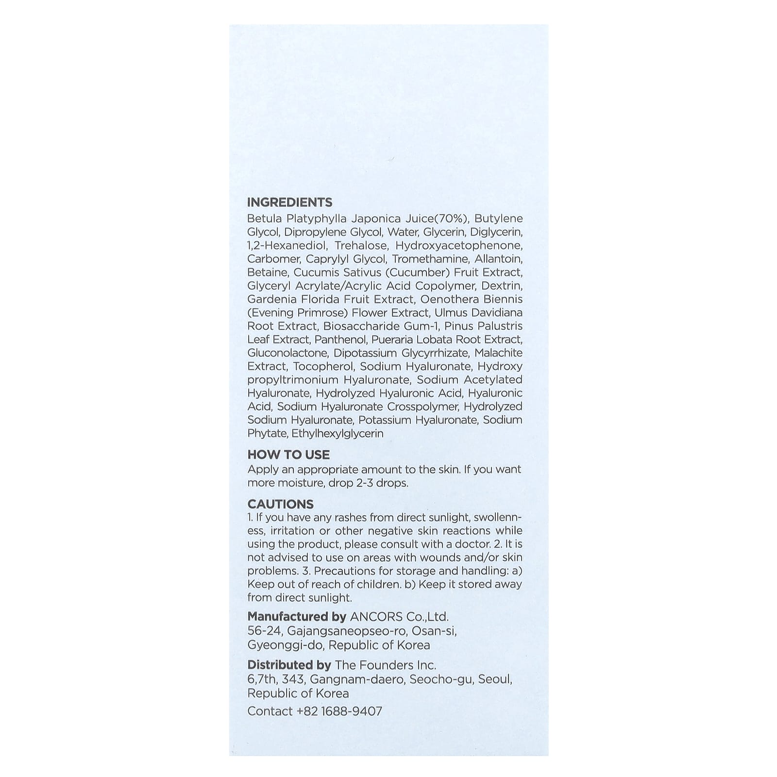 Сок Betula platyphylla japonica (70%), бутиленгликоль, дипропиленгликоль, вода, глицерин, диглицерин, 1,2-гександиол, трегалоза, гидроксиацетофенон, карбомер, каприлилгликоль, трометамин, аллантоин, бетаин, экстракт плодов огурца (Cucumis sativus), сополимер глицерил акрилата/акриловой кислоты, декстрин, экстракт плодов гардении жасминовидной (Gardenia florida), экстракт цветков примулы вечерней (Oenothera biennis), экстракт корня вяза Давида (Ulmus davidiana), биосахаридная смола-1, экстракт хвои сосны болотной (Pinus palustris), пантенол, экстракт корней пуэрарии дольчатой (Pueraria lobata), глюконолактон, дикалия глицирризат, экстракт малахита, токоферол, гиалуронат натрия, гидроксипропилтримония гиалуронат, ацетилированный гиалуронат натрия, гидролизованная гиалуроновая кислота, гиалуроновая кислота, кроссполимер гиалуроната натрия, гидролизованный гиалуронат натрия, гиалуронат калия, фитат натрия, этилгексилглицерин.