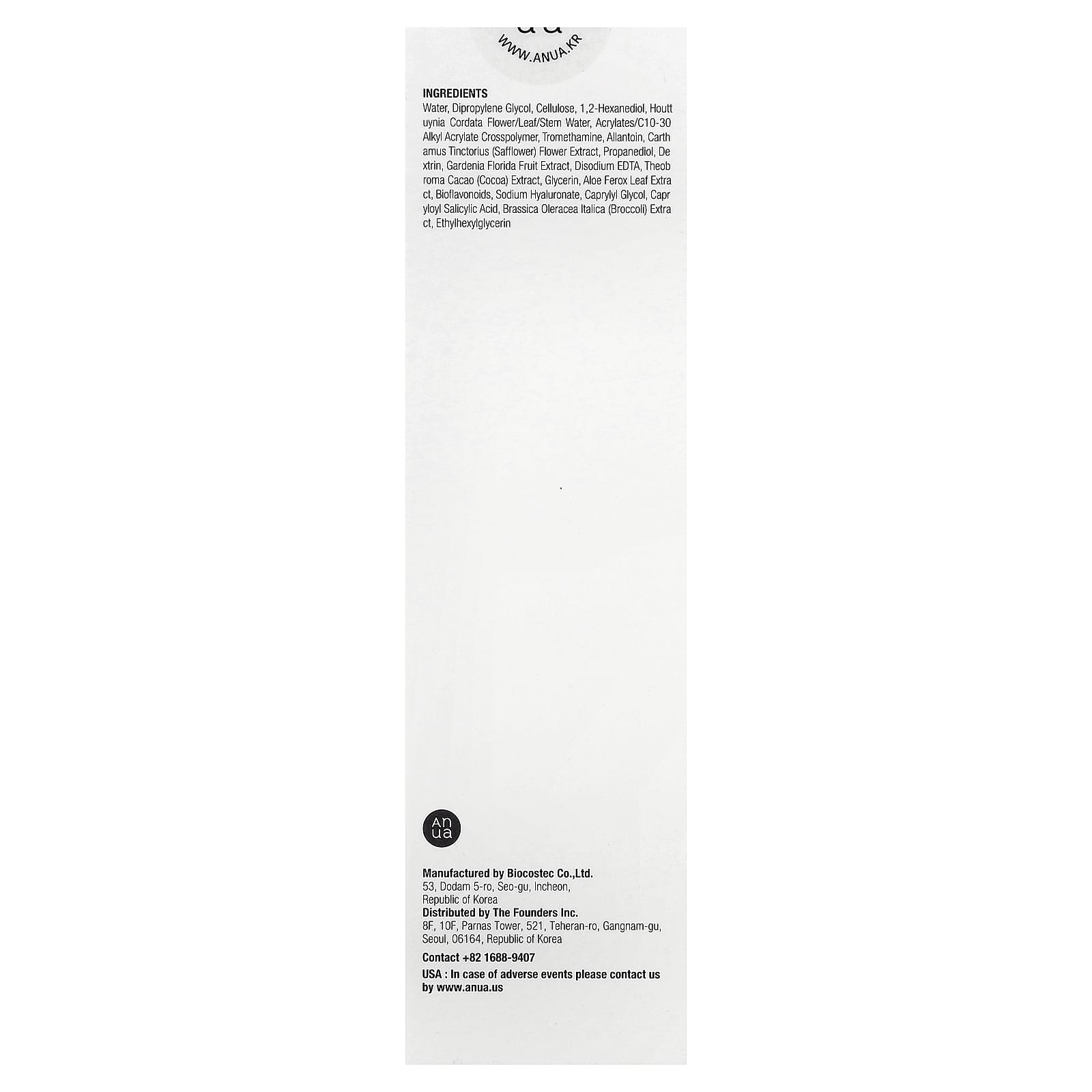 Вода, дипропиленгликоль, целлюлоза, 1,2-гександиол, вода из цветков/листьев/стеблей хауттюйнии (Houttuynia cordata), акрилат/c10-30 алкил акрилат кроссполимер, трометамин, аллантоин, экстракт цветков сафлора (Carthamus tinctorius), пропандиол, декстрин, экстракт плодов гардении жасминовидной (Gardenia florida), двунатриевая ЭДТК, экстракт какао (Theobroma cacao), глицерин, экстракт листьев алоэ вера (Aloe ferox), биофлавоноиды, гиалуронат натрия, каприлилгликоль, каприлоил салициловой кислоты, экстракт брокколи (Brassica oleracea italica), этилгексилглицерин.