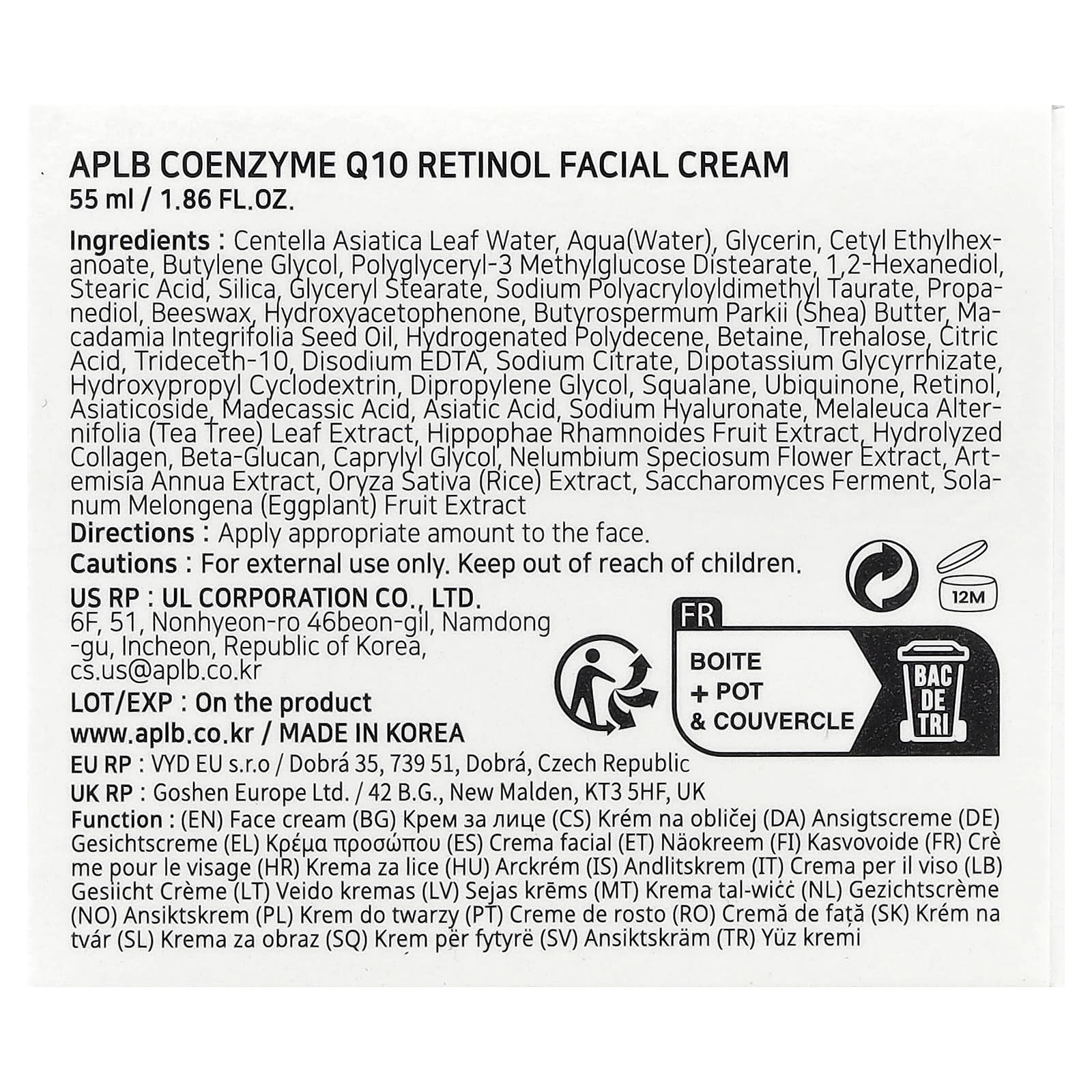 Вода из листьев центеллы азиатской, вода, глицерин, цетилэтилгексаноат, бутиленгликоль, полиглицерил-3 метилглюкозы дистеарат, 1,2-гександиол, стеариновая кислота, диоксид кремния, глицерил стеарат, полиакрилодиметил таурат натрия, пропандиол, пчелиный воск, гидроксиацетофенон, масло ши (Butyrospermum parkii), масло макадамии (Macadamia integrifolia), гидрогенизированный полидецен, бетаин, трегалоза, лимонная кислота, тридецет-10, двунатриевая ЭДТК, цитрат натрия, дикалия глицирризат, гидроксипропил циклодекстрин, дипропиленгликоль, сквалан, убихинон, ретинол, азиатикозид, мадекассовая кислота, азиатиковая кислота, гиалуронат натрия, экстракт листьев чайного дерева (Melaleuca alternifolia), экстракт плодов облепихи крушиновидной (Hippophae rhamnoides), гидролизованный коллаген, бета-глюкан, каприлилгликоль, экстракт цветков лотоса (Nelumbium speciosum), экстракт полыни однолетней (Artemisia annua), экстракт риса (Oryza sativa), продукт ферментации сахаромицетов, экстракт плодов баклажана (Solanum melongena).