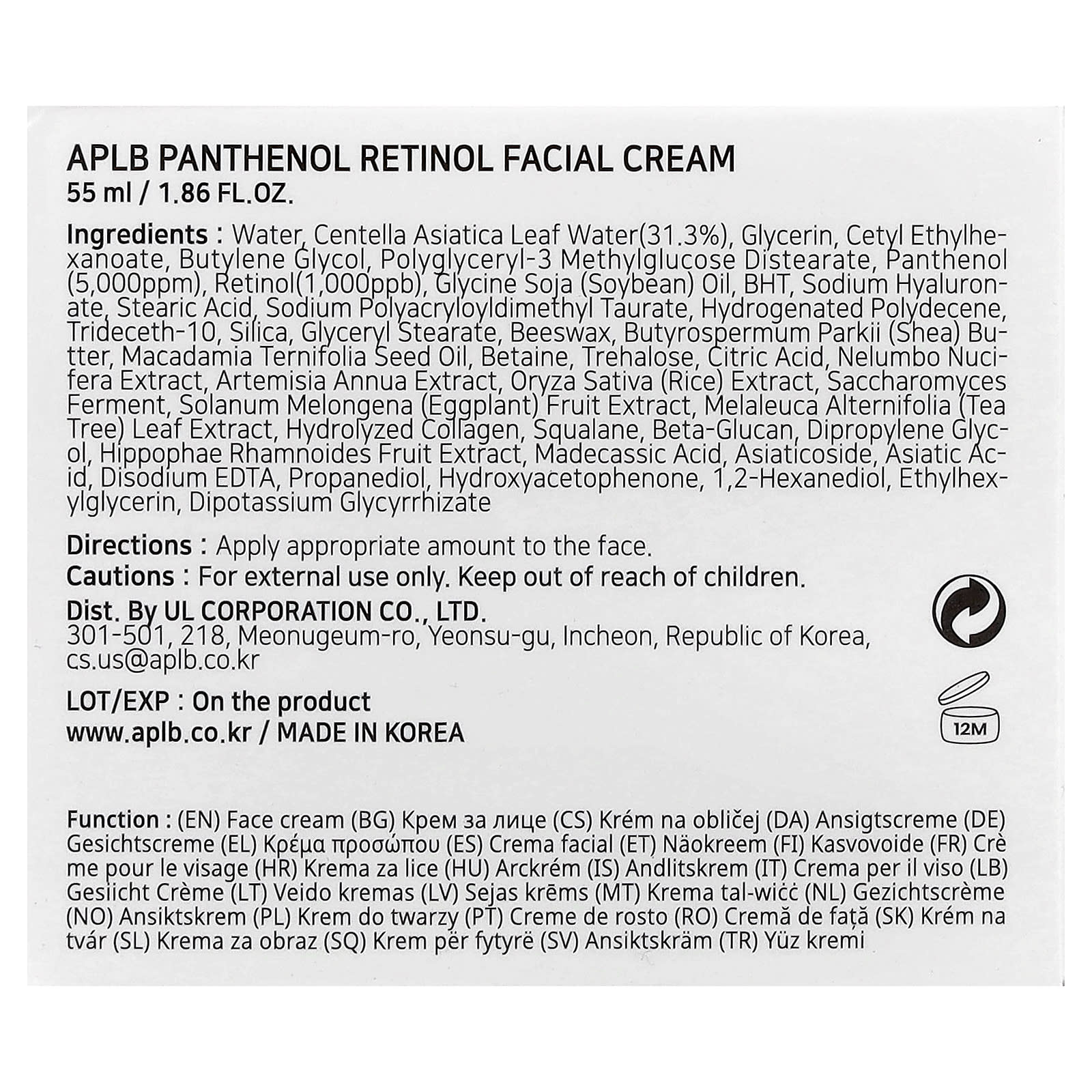 Вода, вода из листьев центеллы азиатской (31,3%), глицерин, цетилэтилгексаноат, бутиленгликоль, полиглицерил-3 метилглюкозы дистеарат, пантенол (5000 част. / млн), ретинол (1000 част. / млрд), соевое масло (Glycine soja), бутилгидрокситолуол, гиалуронат натрия, стеариновая кислота, полиакрилодиметил таурат натрия, гидрогенизированный полидецен, тридецет-10, диоксид кремния, глицерил стеарат, пчелиный воск, масло ши (Butyrospermum parkii), масло макадамии (Macadamia ternifolia), бетаин, трегалоза, лимонная кислота, экстракт лотоса орехоносного (Nelumbo nucifera), экстракт полыни однолетней (Artemisia annua), экстракт риса (Oryza sativa), продукт ферментации сахаромицетов, экстракт плодов баклажана (Solanum melongena), экстракт листьев чайного дерева (Melaleuca alternifolia), гидролизованный коллаген, сквалан, бета-глюкан, дипропиленгликоль, экстракт плодов облепихи крушиновидной (Hippophae rhamnoides), мадекассовая кислота, азиатикозид, азиатиковая кислота, двунатриевая ЭДТК, пропандиол, гидроксиацетофенон, 1,2-гександиол, этилгексилглицерин, дикалия глицирризат.