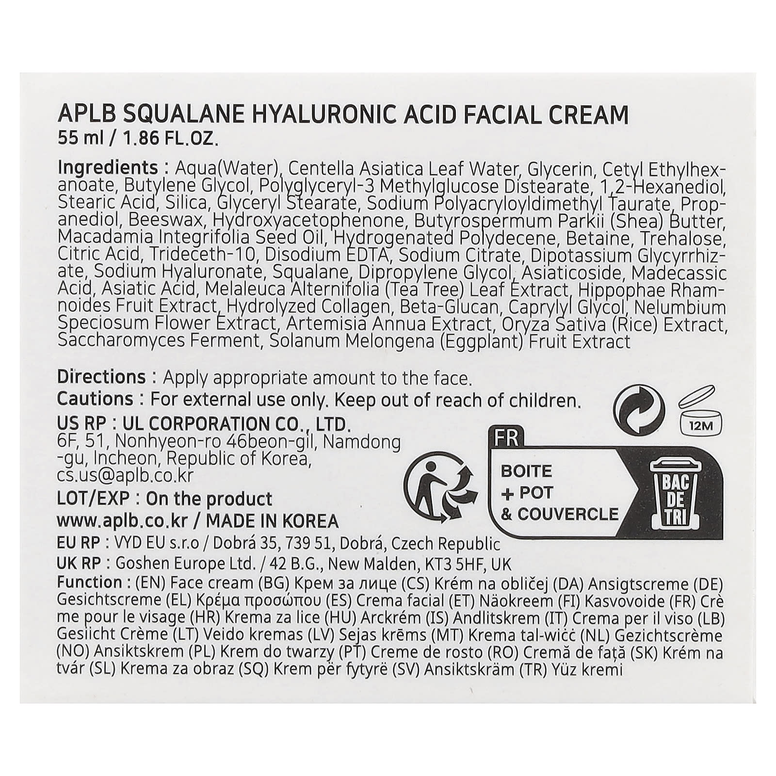 Вода, вода из листьев готу колы (Centella asiatica), глицерин, цетил этилгексноат, бутиленгликоль, полиглицерил-3 метилглюкозы дистеарат, 1,2-гександиол, стеариновая кислота, диоксид кремния, глицерил стеарат, полиакрилодиметил таурат натрия, пропандиол, пчелиный воск, гидроксиацетофенон, масло ши (Butyrospermum parkii), масло макадамии (Macadamia integrifolia), гидрогенизированный полидецен, бетаин, трегалоза, лимонная кислота, тридецет-10, двунатриевая ЭДТК, цитрат натрия, дикалия глицирризат, гиалуронат натрия, сквалан, дипропиленгликоль, азиатикозид, мадекассовая кислота, азиатиковая кислота, экстракт листьев чайного дерева (Melaleuca alternifolia), экстракт плодов облепихи крушиновидной (Hippophae rhamnoides), гидролизованный коллаген, бета-глюкан, каприлилгликоль, экстракт цветков лотоса (Nelumbium speciosum), экстракт полыни однолетней (Artemisia annua), экстракт риса (Oryza sativa), продукт ферментации сахаромицетов, экстракт плодов баклажана (Solanum melongena).