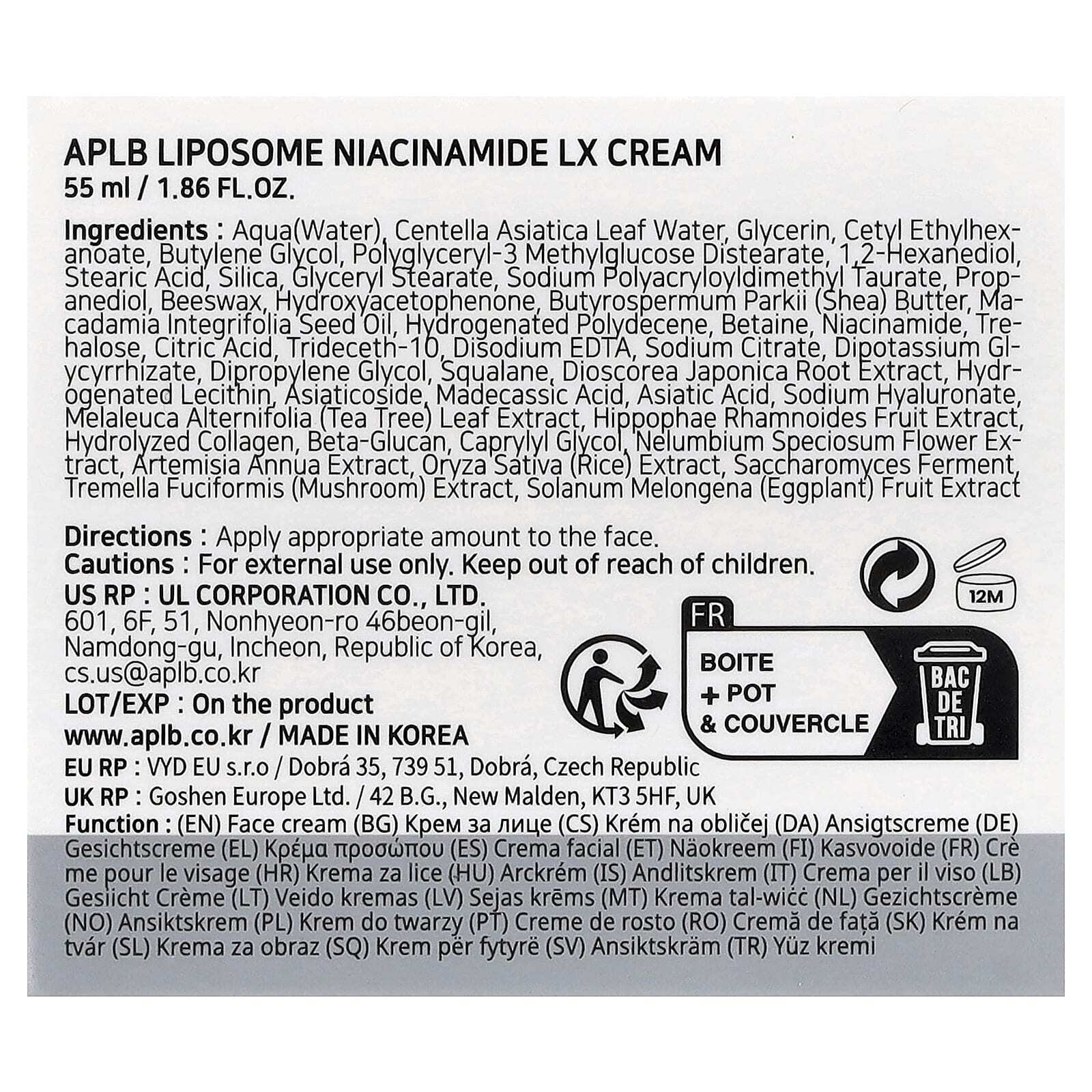 Вода, вода из листьев готу колы (Centella asiatica), глицерин, цетилэтилгексаноат, бутиленгликоль, полиглицерил-3 метилглюкозы дистеарат, 1,2-гександиол, стеариновая кислота, диоксид кремния, глицерил стеарат, полиакрилодиметил таурат натрия, пропандиол, пчелиный воск, гидроксиацетофенон, масло ши (Butyrospermum parkii), масло макадамии (Macadamia integrifolia), гидрогенизированный полидецен, бетаин, никотинамид, трегалоза, лимонная кислота, тридецет-10, двунатриевая ЭДТК, цитрат натрия, дикалия глицирризат, дипропиленгликоль, сквалан, экстракт корня диоскореи японской (Dioscorea japonica), гидрогенизированный лецитин, азиатикозид, мадекассовая кислота, азиатиковая кислота, гиалуронат натрия, экстракт листьев чайного дерева (Melaleuca alternifolia), экстракт плодов облепихи крушиновидной (Hippophae rhamnoides), гидролизованный коллаген, бета-глюкан, каприлилгликоль, экстракт цветков лотоса (Nelumbium speciosum), экстракт полыни однолетней (Artemisia annua), экстракт риса (Oryza sativa), продукт ферментации сахаромицетов, экстракт снежного гриба (Tremella fuciformis), экстракт плодов баклажана (Solanum melongena).