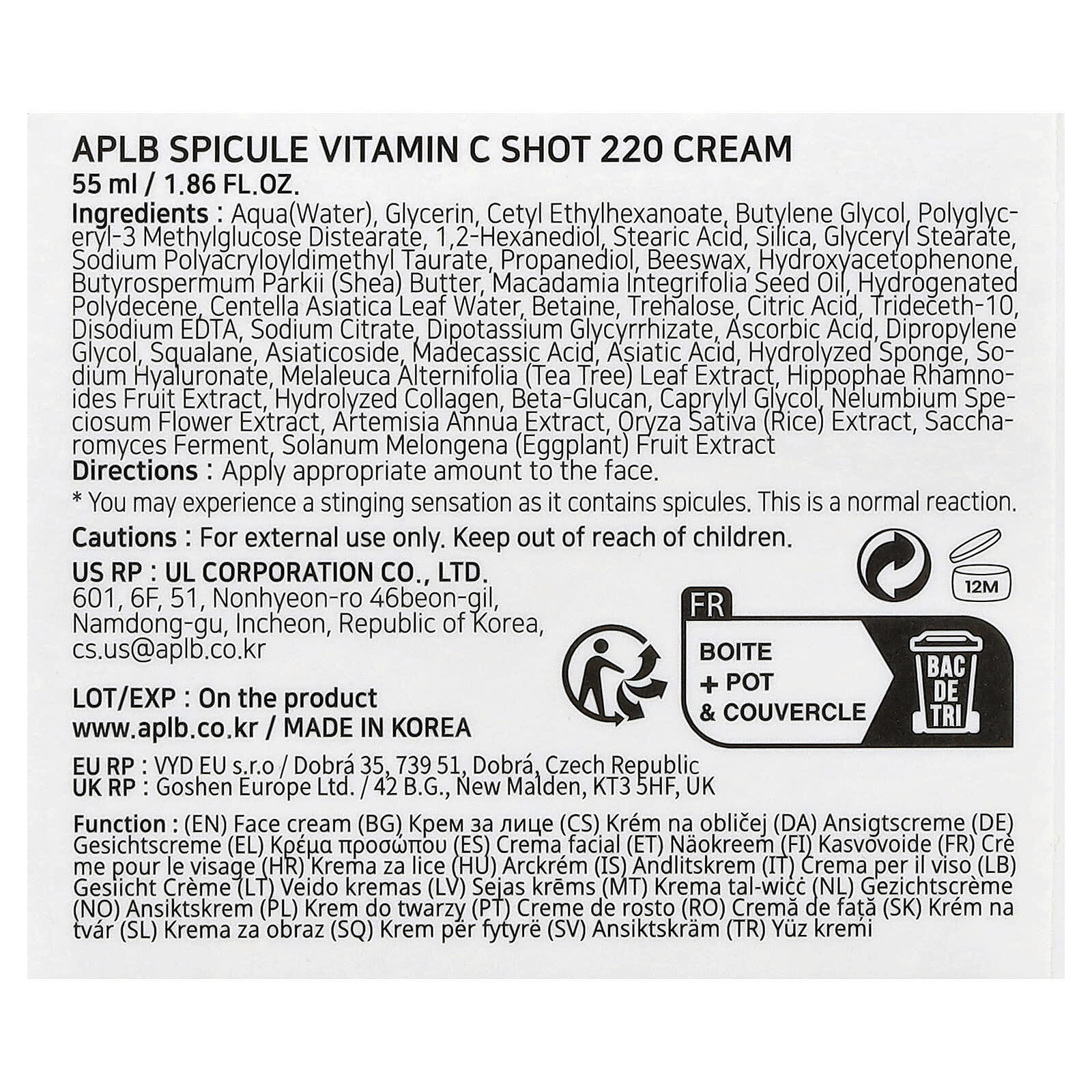 Вода, глицерин, цетилэтилгексаноат, бутиленгликоль, полиглицерил-3 метилглюкозы дистеарат, 1,2-гександиол, стеариновая кислота, диоксид кремния, глицерил стеарат, полиакрилодиметил таурат натрия, пропандиол, пчелиный воск, масло ши (гидроксиацетофенон), масло макадамии (Macadamia integrifolia), гидрогенизированный полидецен, вода из листьев готу колы (Centella asiatica), бетаин, трегалоза, лимонная кислота, тридецет-10, двунатриевая ЭДТК, цитрат натрия, дикалия глицирризат, аскорбиновая кислота, дипропиленгликоль, сквалан, азиатикозид, мадекассовая кислота, азиатиковая кислота, гидролизованная губка, гиалуронат натрия, экстракт листьев чайного дерева (Melaleuca alternifolia), экстракт плодов облепихи крушиновидной (Hippophae rhamnoides), гидролизованный коллаген, бета-глюкан, каприлилгликоль, экстракт цветков лотоса (Nelumbium speciosum), экстракт полыни однолетней (Artemisia annua), экстракт риса (Oryza sativa), продукт ферментации сахаромицетов, экстракт плодов баклажана (Solanum melongena).