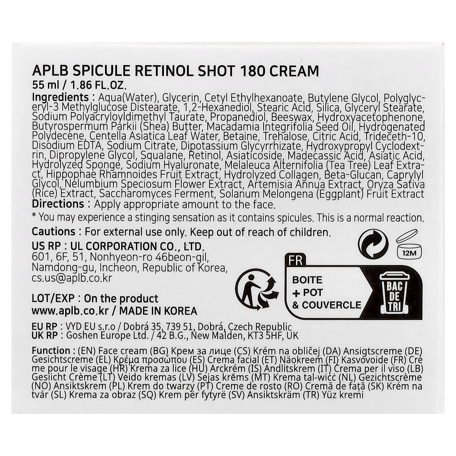 Вода, глицерин, цетилэтилгексаноат, бутиленгликоль, полиглицерил-3 метилглюкозы дистеарат, 1,2-гександиол, стеариновая кислота, диоксид кремния, глицерил стеарат, полиакрилодиметил таурат натрия, пропандиол, пчелиный воск, гидроксиацетофенон, масло ши (Butyrospermum parkii), масло макадамии (Macadamia integrifolia), гидрогенизированный полидецен, вода из листьев готу колы (Centella asiatica), бетаин, трегалоза, лимонная кислота, тридецет-10, двунатриевая ЭДТК, цитрат натрия, дикалия глицирризат, гидроксипропил циклодекстрин, дипропиленгликоль, сквалан, ретинол, азиатикозид, мадекассовая кислота, азиатиковая кислота, гидролизованная губка, гиалуронат натрия, экстракт листьев чайного дерева (Melaleuca alternifolia), экстракт плодов облепихи крушиновидной (Hippophae rhamnoides), гидролизованный коллаген, бета-глюкан, каприлилгликоль, экстракт цветков лотоса (Nelumbium speciosum), экстракт полыни однолетней (Artemisia annua), экстракт риса (Oryza sativa), продукт ферментации сахаромицетов, экстракт плодов баклажана (Solanum melongena).