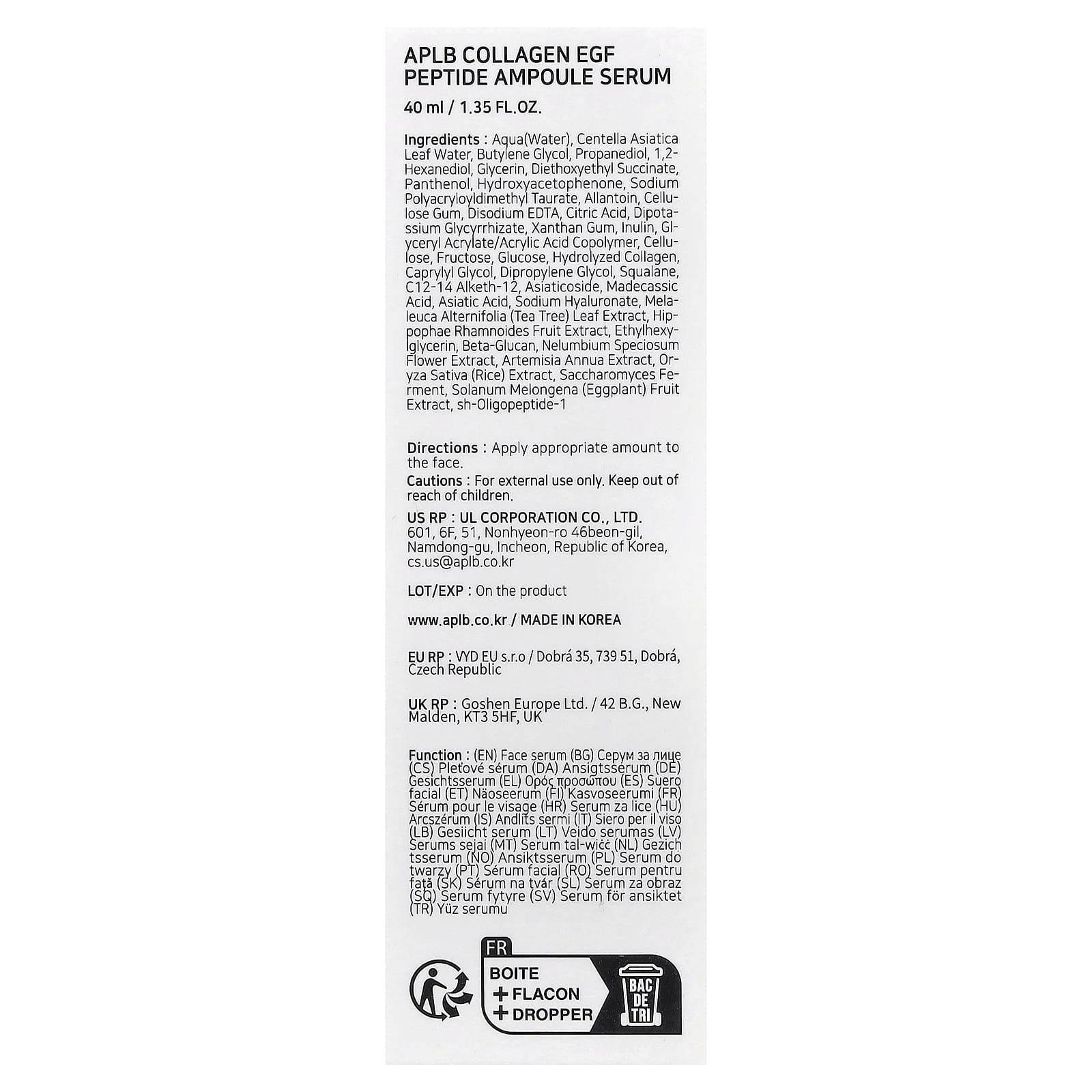 Вода, вода из листьев готу колы (Centella asiatica), бутиленгликоль, пропандиол, 1,2-гександиол, глицерин, диэтоксиэтил сукцинат, пантенол, гидроксиацетофенон, полиакрилодиметил таурат натрия, аллантоин, целлюлозная камедь, двунатриевая ЭДТК, лимонная кислота, дикалия глицирризат, ксантановая камедь, инулин, сополимер глицерил акрилата/акриловой кислоты, целлюлоза, фруктоза, глюкоза, гидролизованный коллаген, каприлилгликоль, дипропиленгликоль, сквалан, c12-14 алкет-12, азиатикозид, мадекассовая кислота, азиатиковая кислота, гиалуронат натрия, экстракт листьев чайного дерева (Melaleuca alternifolia), экстракт плодов облепихи крушиновидной (Hippophae rhamnoides), этилгексиглицерин, бета-глюкан, экстракт цветков лотоса (Nelumbium speciosum), экстракт полыни однолетней (Artemisia annua), экстракт риса (Oryza sativa), продукт ферментации сахаромицетов, экстракт плодов баклажана (Solanum melongena), sh-олигопептид-1.