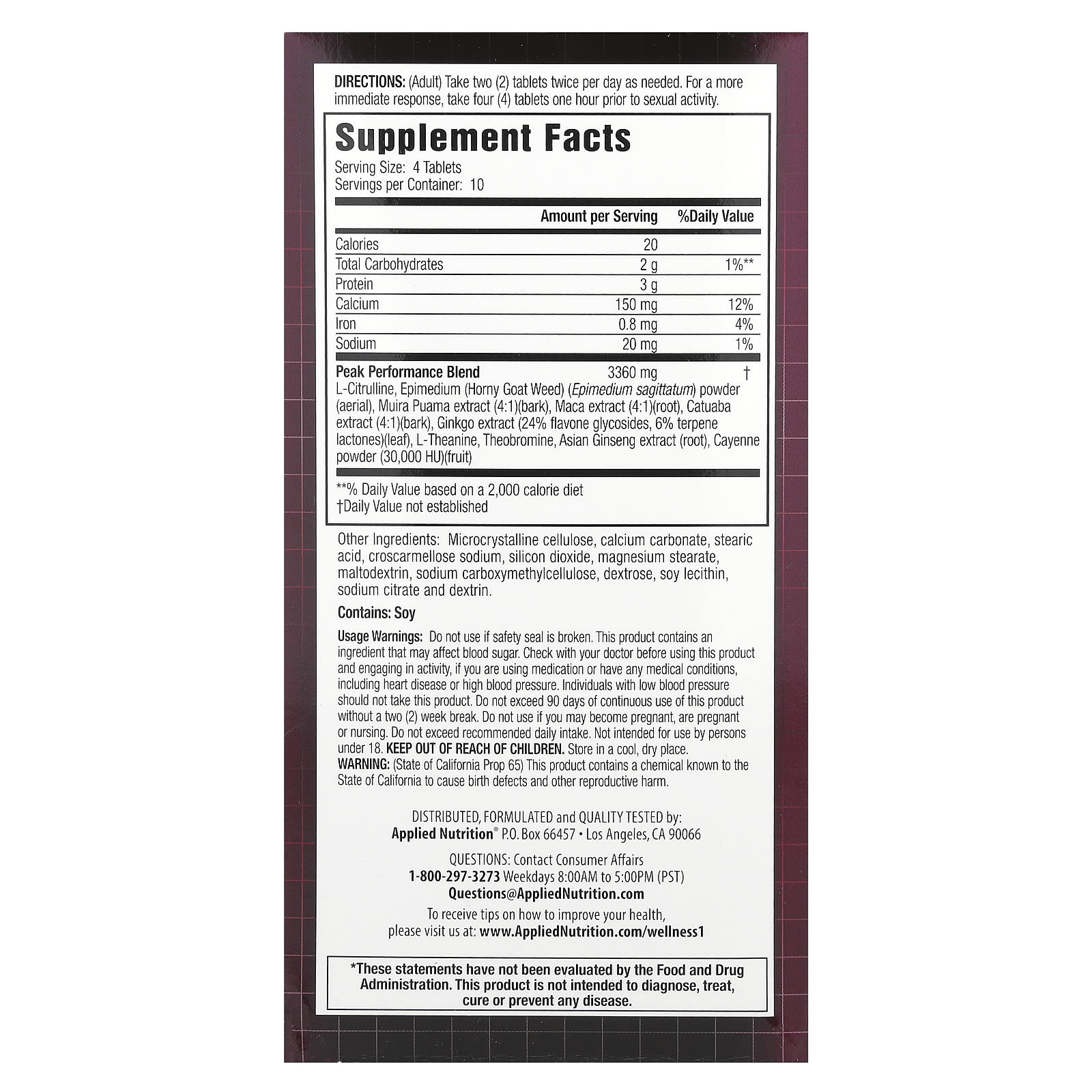 Предупреждения: Не применяйте при нарушении целостности герметичной упаковки. Препарат содержит компоненты, которые могут влиять на кровяное давление, состояние сердца и/или уровень сахара в крови. Если вы употребляете лекарственные средства или имеете заболевания, в том числе болезни сердца или высокое/низкое кровяное давление, перед применением проконсультируйтесь с врачом. Не принимайте больше 90 дней подряд без двухнедельного перерыва. Если вы готовитесь к беременности, беременны или кормите грудью, не используйте препарат. Не превышайте рекомендуемую суточную норму. Не предназначено для приема лицами до 18 лет. Хранить в недоступном для детей месте. Хранить в сухом прохладном месте.