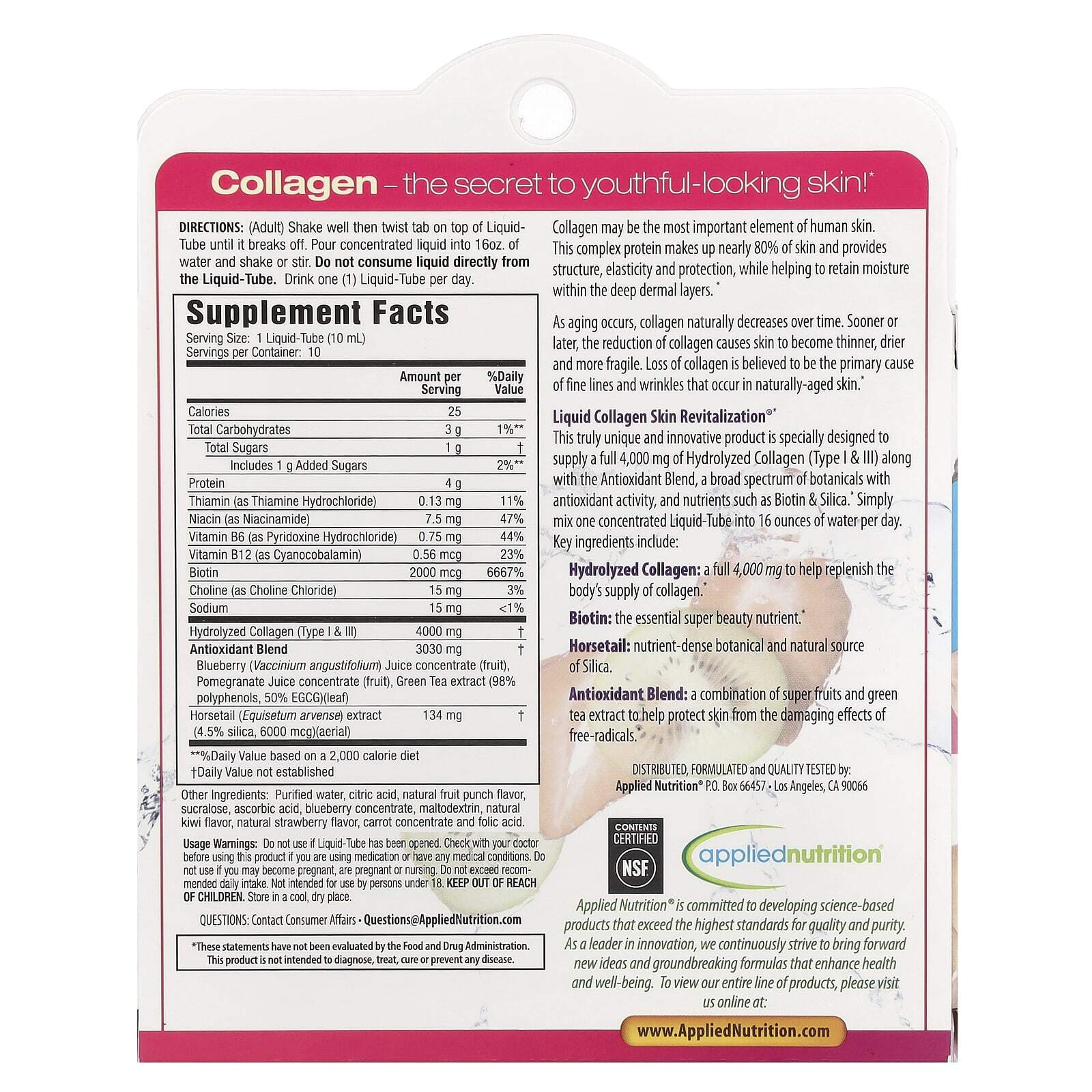 Этот специально разработанный продукт — поистине уникальный и инновационный. Он содержит 4000 мг гидролизованного коллагена (типов I и III), а также смесь антиоксидантов (широкий спектр растительных компонентов с антиоксидантными свойствами) и питательные вещества, такие как биотин и диоксид кремния. Просто смешайте одну ампулу жидкого концентрата с 480 мл (16 унциями) воды для приёма один раз в день. Основные ингредиенты указаны ниже.