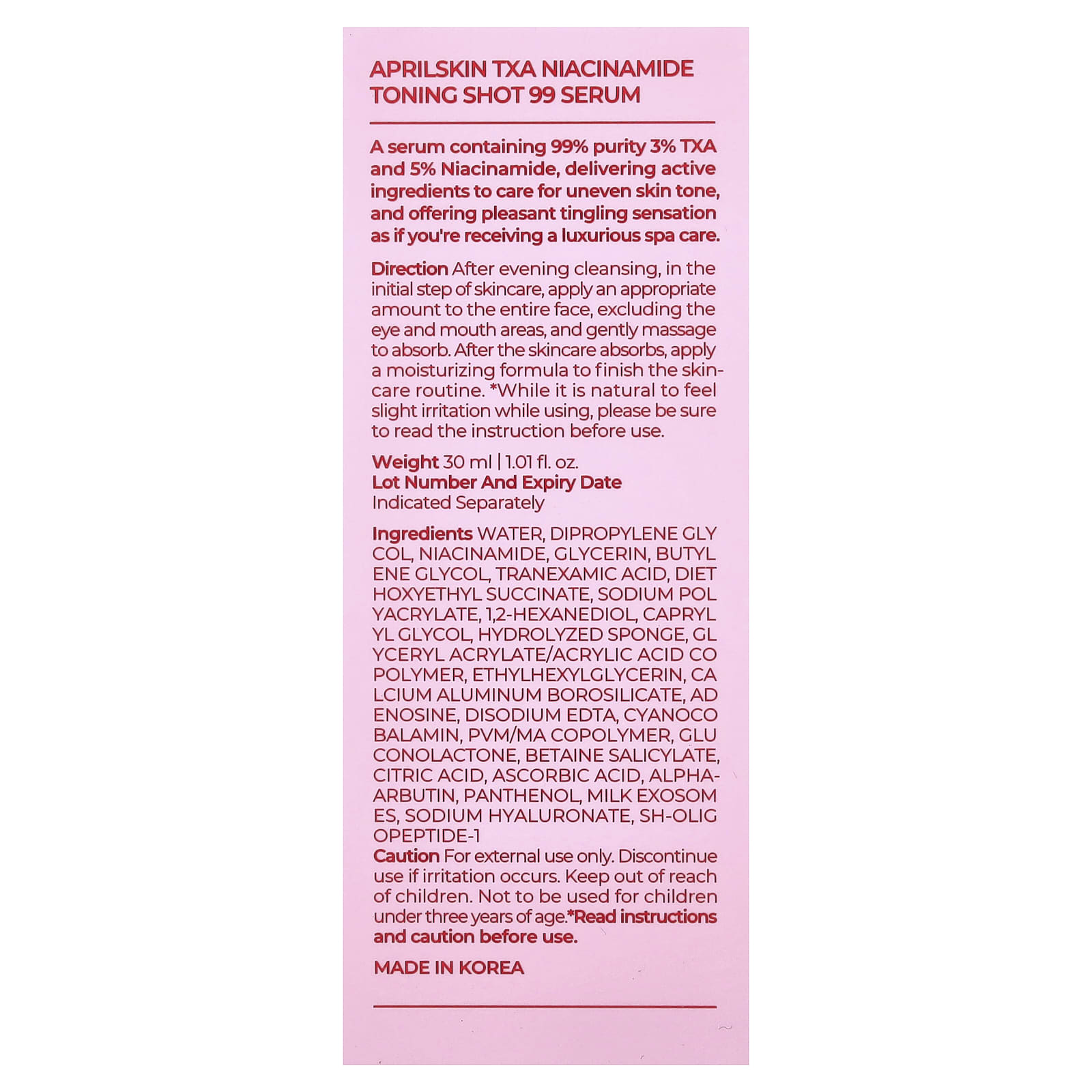 Вода, дипропиленгликоль, никотинамид, глицерин, бутиленгликоль транексаминовая кислота, диетический оксиэтил сукцинат, полиакрилат натрия, 1,2-гександиол, каприлилгликоль, гидролизованная губка, сополимер глицерил акрилата/акриловой кислоты, этилгексилглицерин, кальций алюминий боросиликат, аденозин, двунатриевая ЭДТК, цианокобаламин, ПВМ/МА сополимер, глюконолактон, бетаин салицилат, лимонная кислота, аскорбиновая кислота, альфа-арбутин, пантенол, молочные экстракты, гиалуронат натрия, sh-олигопептид-1.