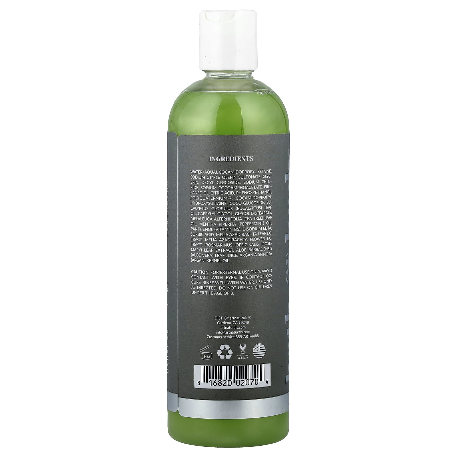 Вода, кокамидопропилбетаин, натрия С14-16 олефин сульфонат, глицерин, децил глюкозид, хлорид натрия, кокоамфоацетат натрия, пропандиол, лимонная кислота, феноксиэтанол поликватерниум-7, кокамидопропил гидроксисултаин, кокоглюкозид, масло из листьев эвкалипта (Eucalyptus globulus), каприлилгликоль, гликоль дистеарат, масло из листьев чайного дерева (Melaleuca alternifolia), масло перечной мяты (Mentha piperita), пантенол (витамин B5), двунатриевая ЭДТК, сорбиновая кислота, экстракт листьев дерева ним (Melia azadirachta), экстракт цветков дерева ним (Melia azadirachta), экстракт листьев розмарина (Rosmarinus officinalis), сок листьев алоэ вера (Aloe barbadensis), масло из косточек арганы (Argania spinosa).