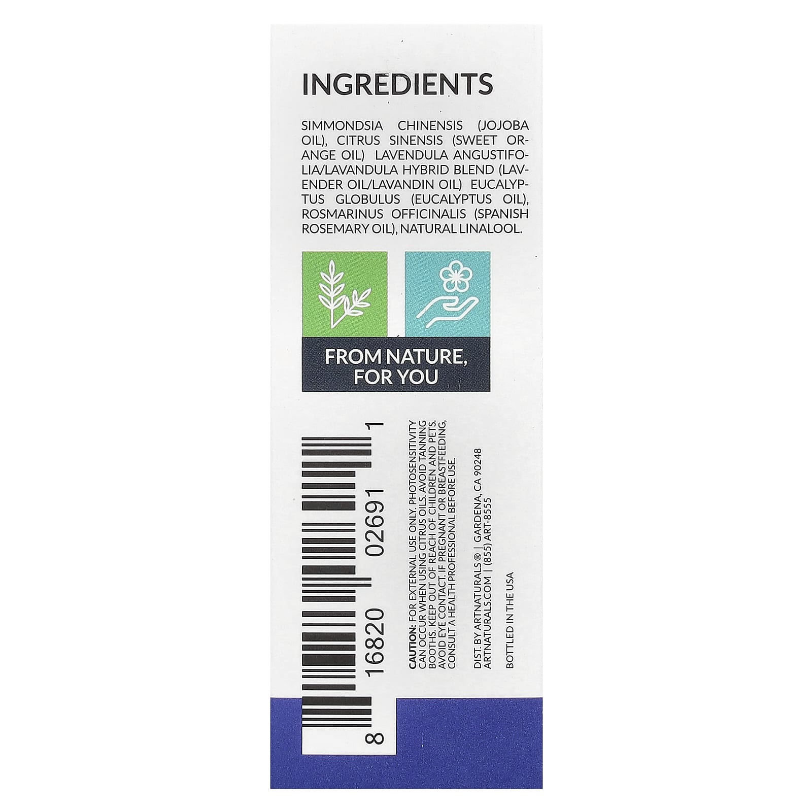 Simmondsia chinensis (масло жожоба), Citrus sinensis (масло сладкого апельсина), смесь гибридов лаванды узколистной (лавандовое масло / лавандиновое масло), эвкалиптовое масло (Eucalyptus globulus), Rosmarinus officinalis (испанское масло розмарина), натуральный линалоол.