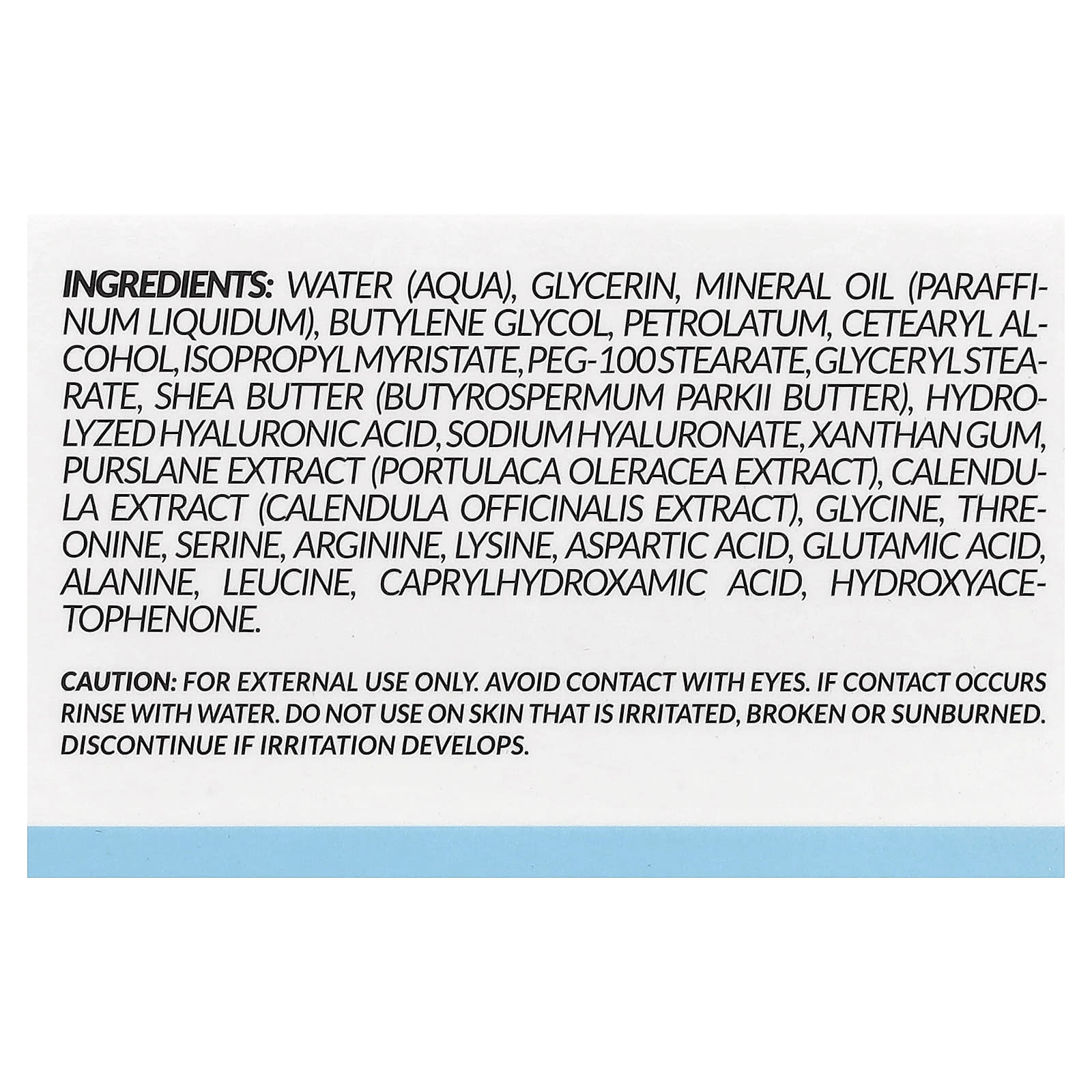 Вода, глицерин, минеральное масло (Paraffinum liquidum), бутиленгликоль, вазелин, цетеариловый спирт, изопропил миристат, ПЭГ-100 стеарат, глицерил стеарат, масло ши (Butyrospermum parkii), гидролизованная гиалуроновая кислота, гиалуронат натрия, ксантановая камедь, экстракт портулака (Portulaca oleracea), экстракт календулы (Calendula officinalis), глицин, треонин, серин, аргинин, лизин, аспарагиновая кислота, глутаминовая кислота, аланин, лейцин, каприлгидроксаминовая кислота, гидроксиацетофенон.