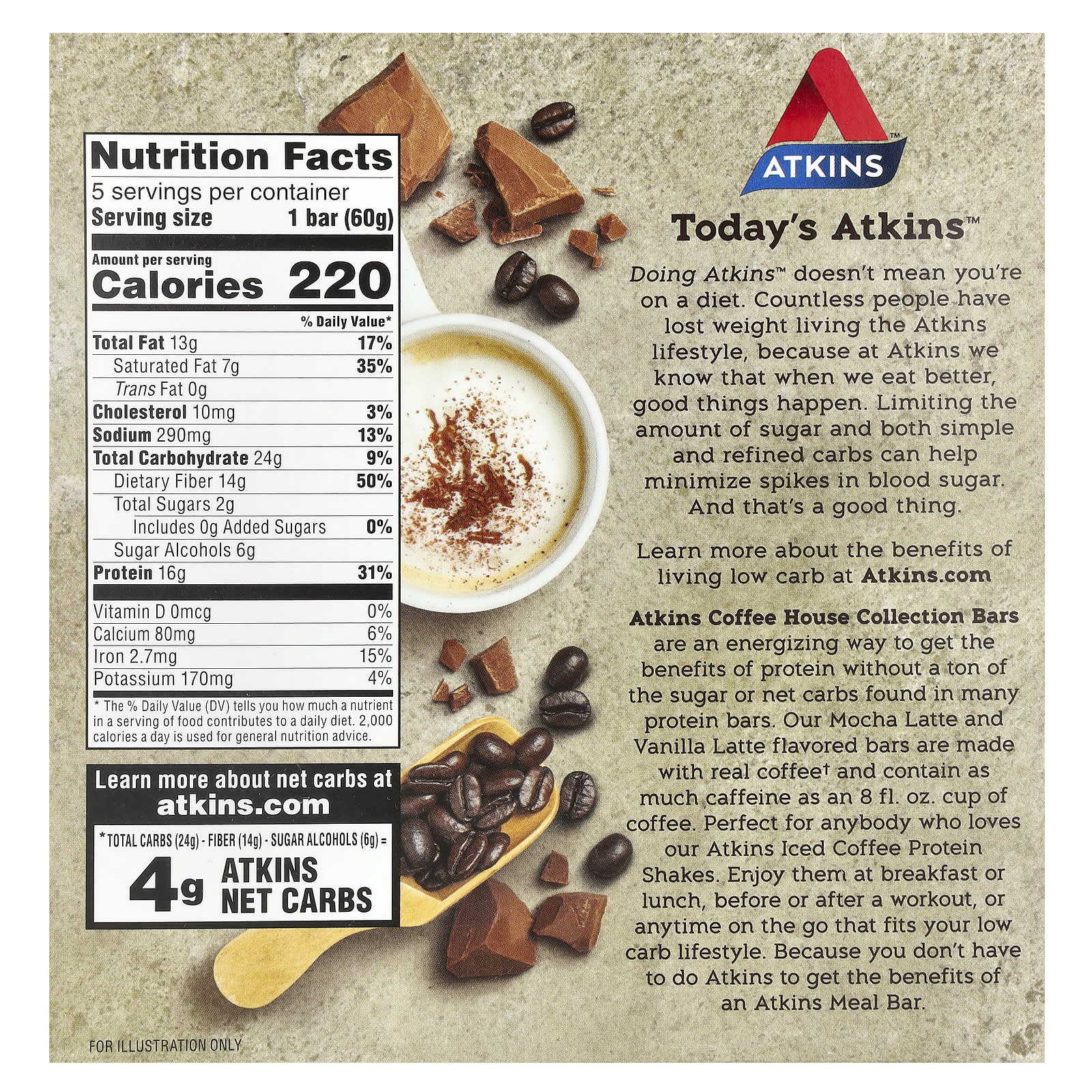 Батончики Atkins Coffee House Collection - это бодрящий способ получить преимущества протеина без тонны сахара или чистых углеводов, которые содержатся во многих протеиновых батончиках. Наши батончики со вкусом мокко латте и ваниль латте сделаны из настоящего кофе† и содержат столько же кофеина, сколько 8 жидк. унция $ 12.99 чашка кофе. Идеально подходит для всех, кто любит наши протеиновые коктейли Atkins со льдом. Наслаждайтесь ими за завтраком или обедом, до или после тренировки или в любое время в дороге, которая соответствует вашему низкоуглеводному образу жизни. Потому что вам не обязательно делать упражнения Аткинса, чтобы получить все преимущества батончика Atkins Meal.